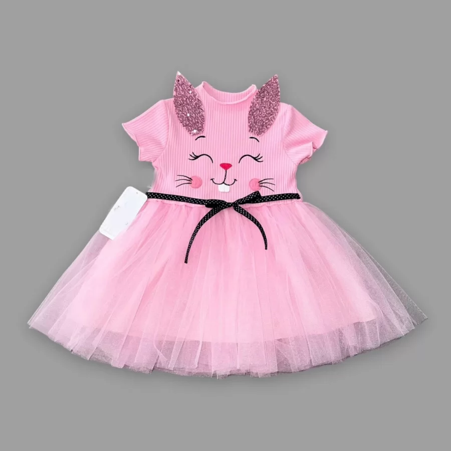 1-2-3 Yaş Payetli Kulak Tavşan Baskılı Kız Bebek Elbisesi Pembe adet