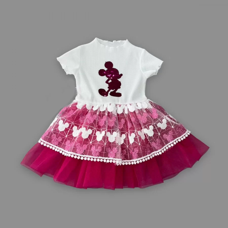 1-2-3 Yaş Payetli Mickey Baskılı Brode Etekli Kız Bebek Elbisesi