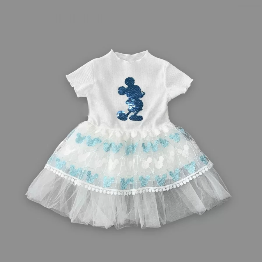 1-2-3 Yaş Payetli Mickey Baskılı Brode Etekli Kız Bebek Elbisesi
