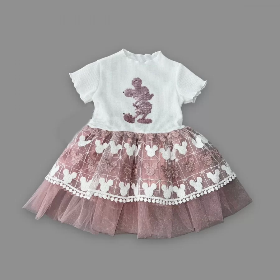 / 1-2-3 Yaş Payetli Mickey Baskılı Brode Etekli Kız Bebek Elbisesi Gül Kurusu