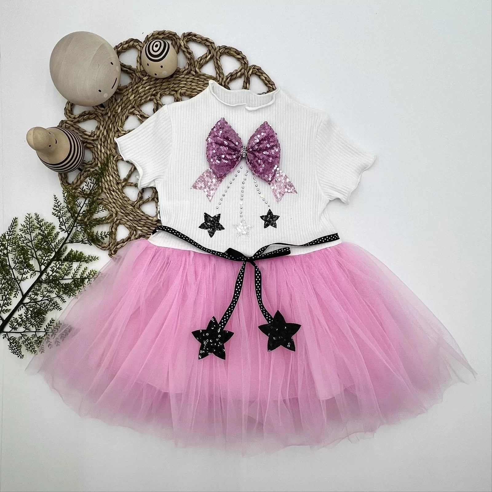 1-2-3 Yaş Payetli Yıldız Nakışlı Astarlı Etek Kız Bebek Tütü Elbisesi Beyaz