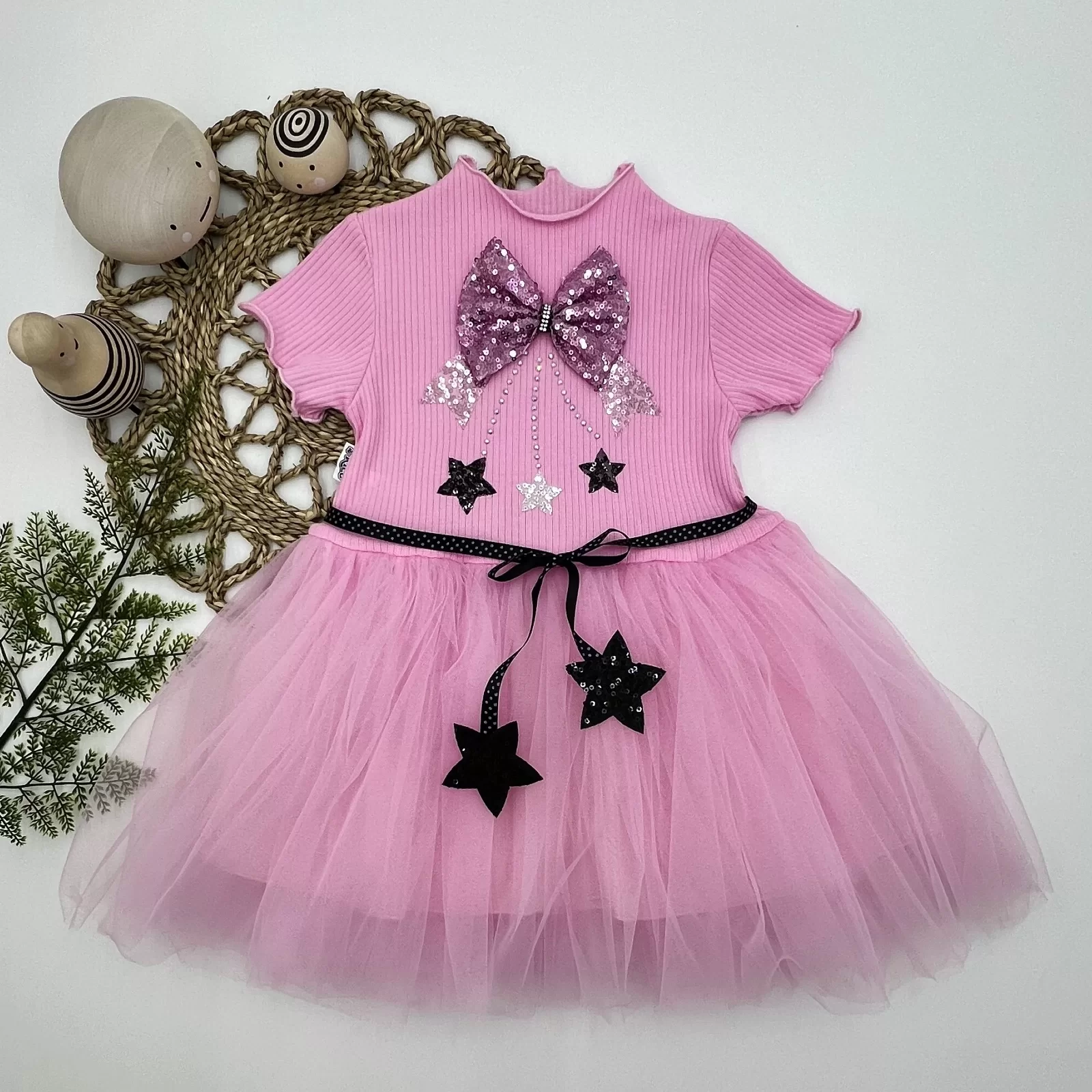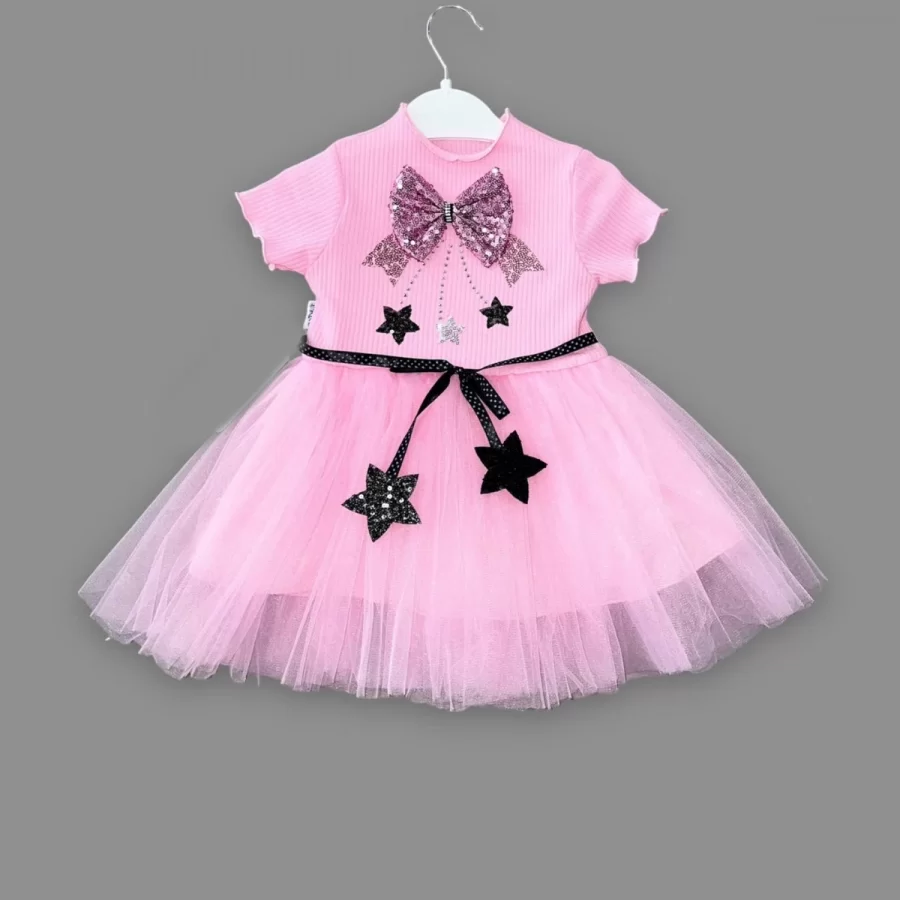1-2-3 Yaş Payetli Yıldız Nakışlı Astarlı Etek Kız Bebek Tütü Elbisesi Pembe adet