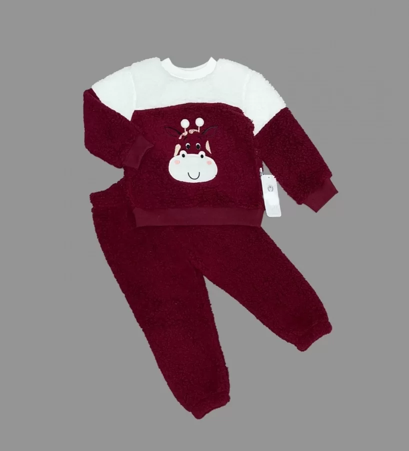 1-2-3 Yaş Ponponlu Zürafa Desenli Kuzu Kumaş Uzun Kollu 2li Kız Erkek Çocuk Takımı Bordo