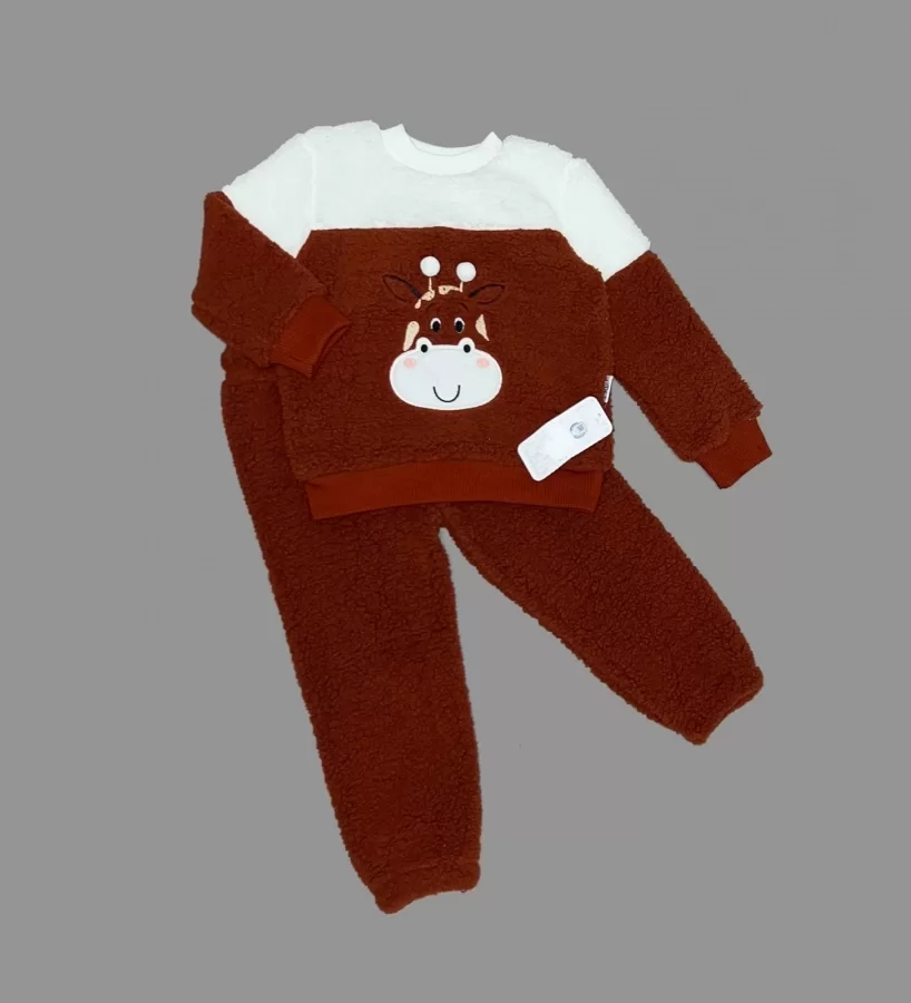 1-2-3 Yaş Ponponlu Zürafa Desenli Kuzu Kumaş Uzun Kollu 2li Kız Erkek Çocuk Takımı Kahverengi
