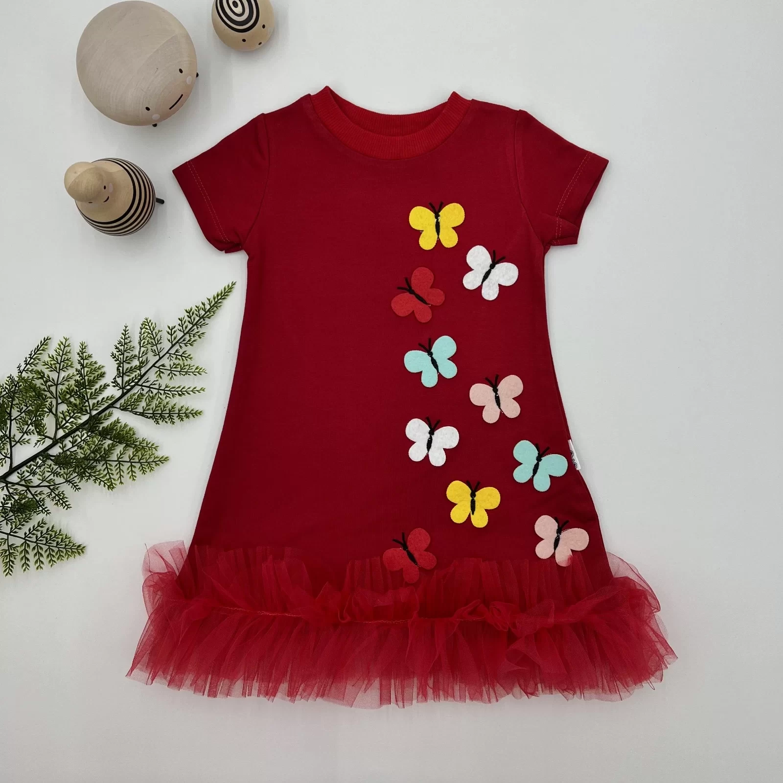 / 1-2-3 Yaş Renkli Kelebekler Nakışlı Eteği Fırfırlı Jile Çocuk Elbisesi Kırmızı