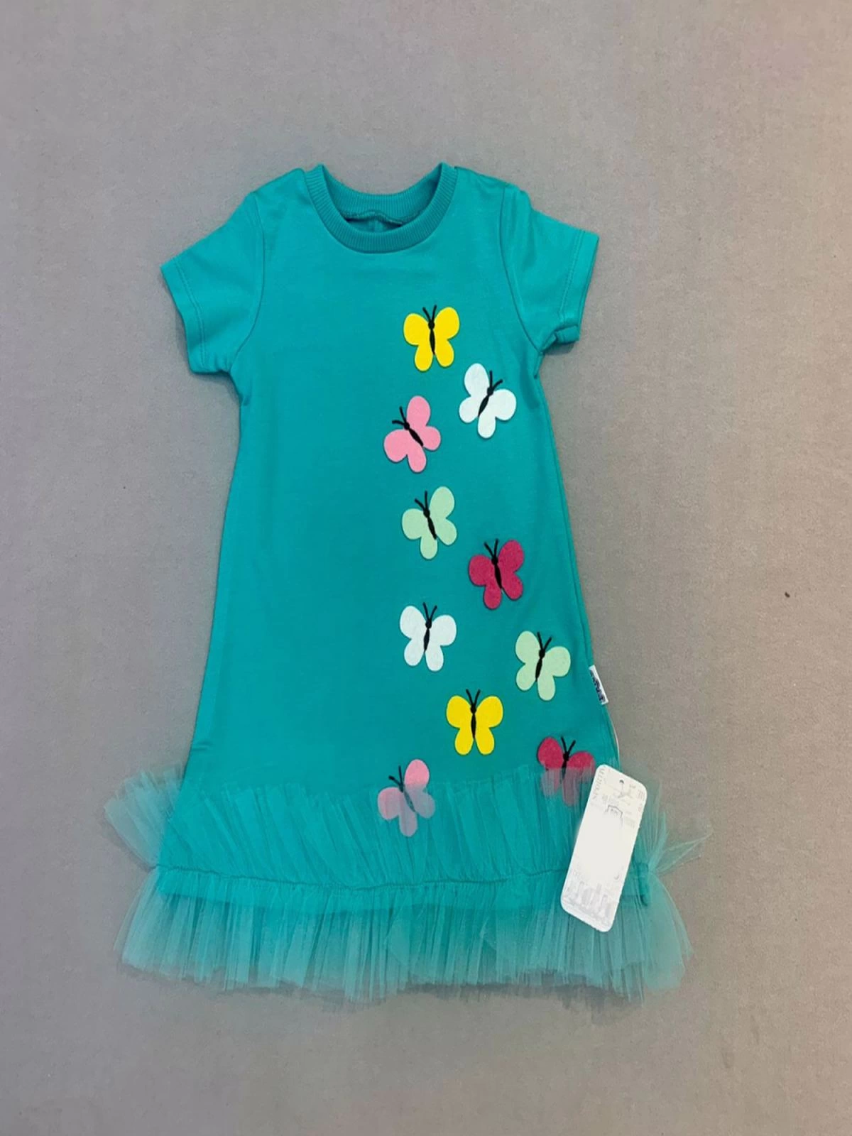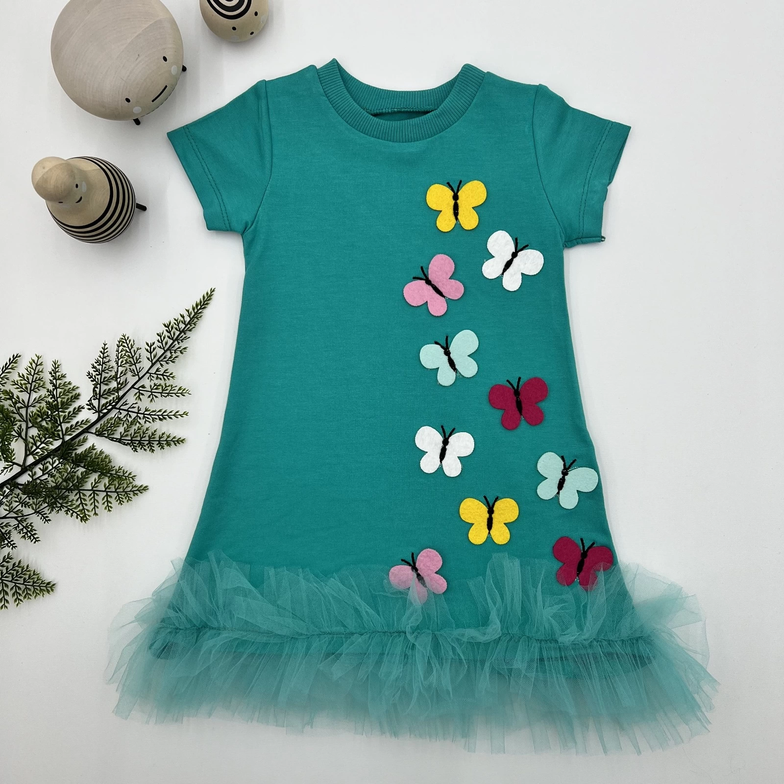 1-2-3 Yaş Renkli Kelebekler Nakışlı Eteği Fırfırlı Jile Çocuk Elbisesi Turkuaz