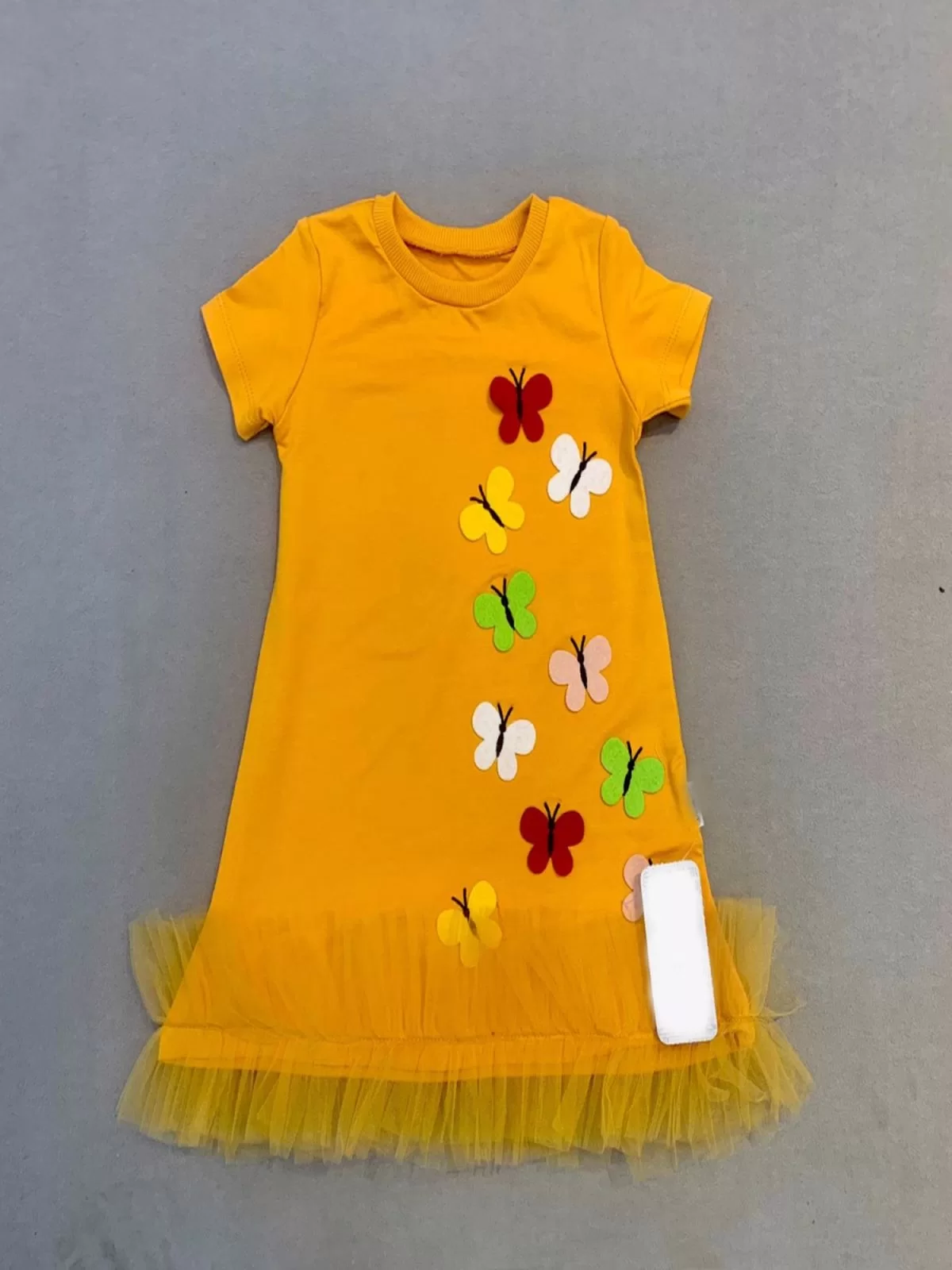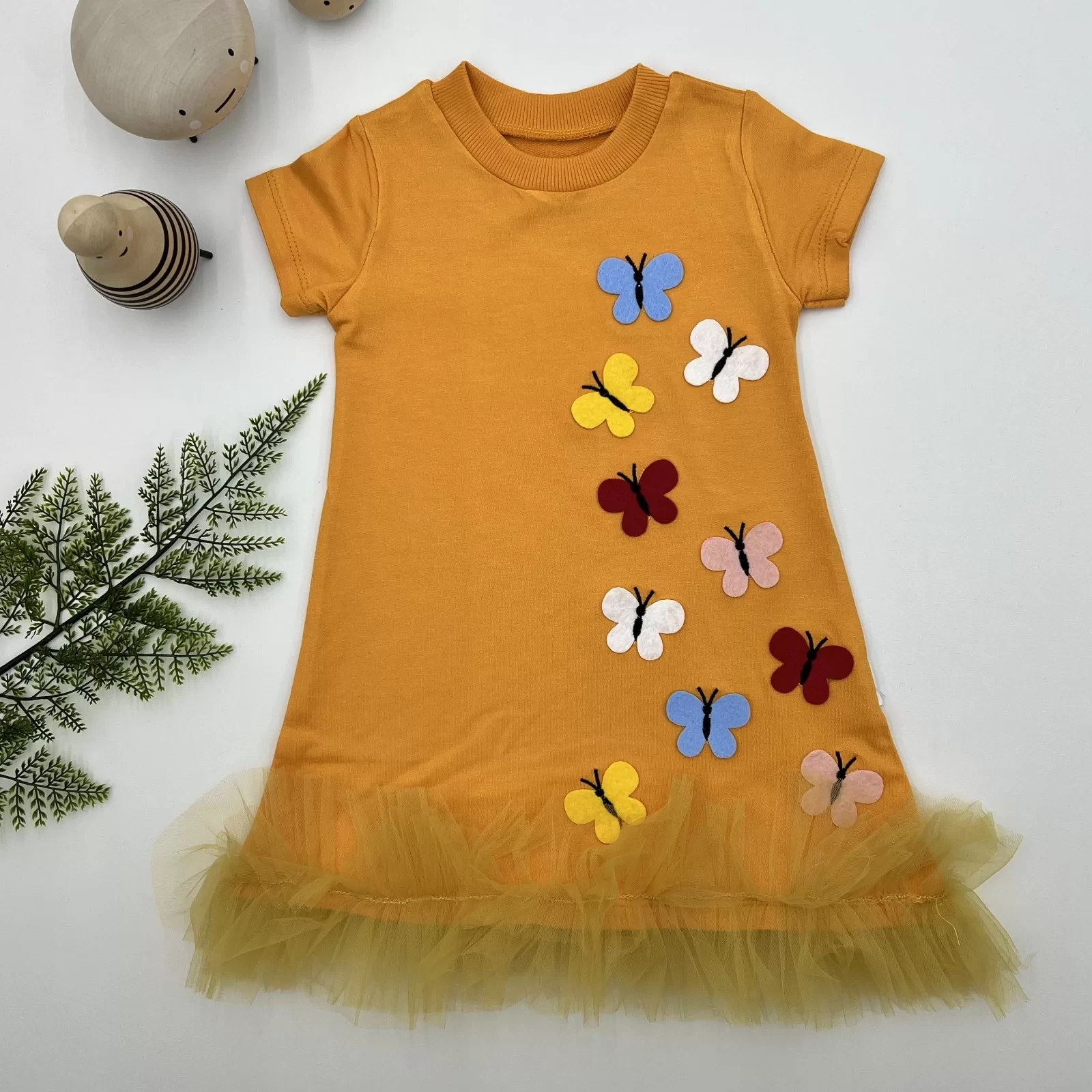 1-2-3 Yaş Renkli Kelebekler Nakışlı Eteği Fırfırlı Jile Çocuk Elbisesi Turuncu adet