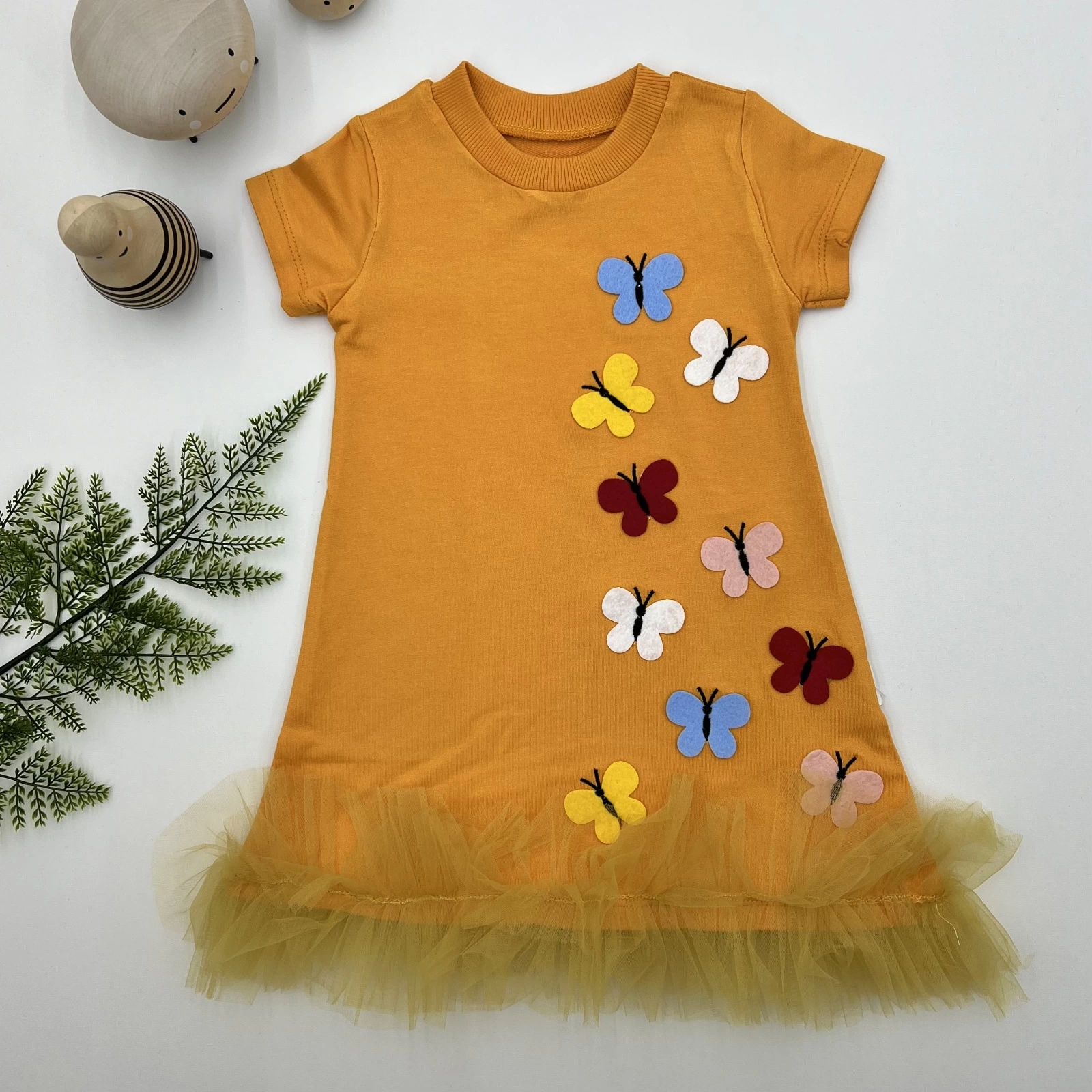 1-2-3 Yaş Renkli Kelebekler Nakışlı Eteği Fırfırlı Jile Çocuk Elbisesi Turuncu