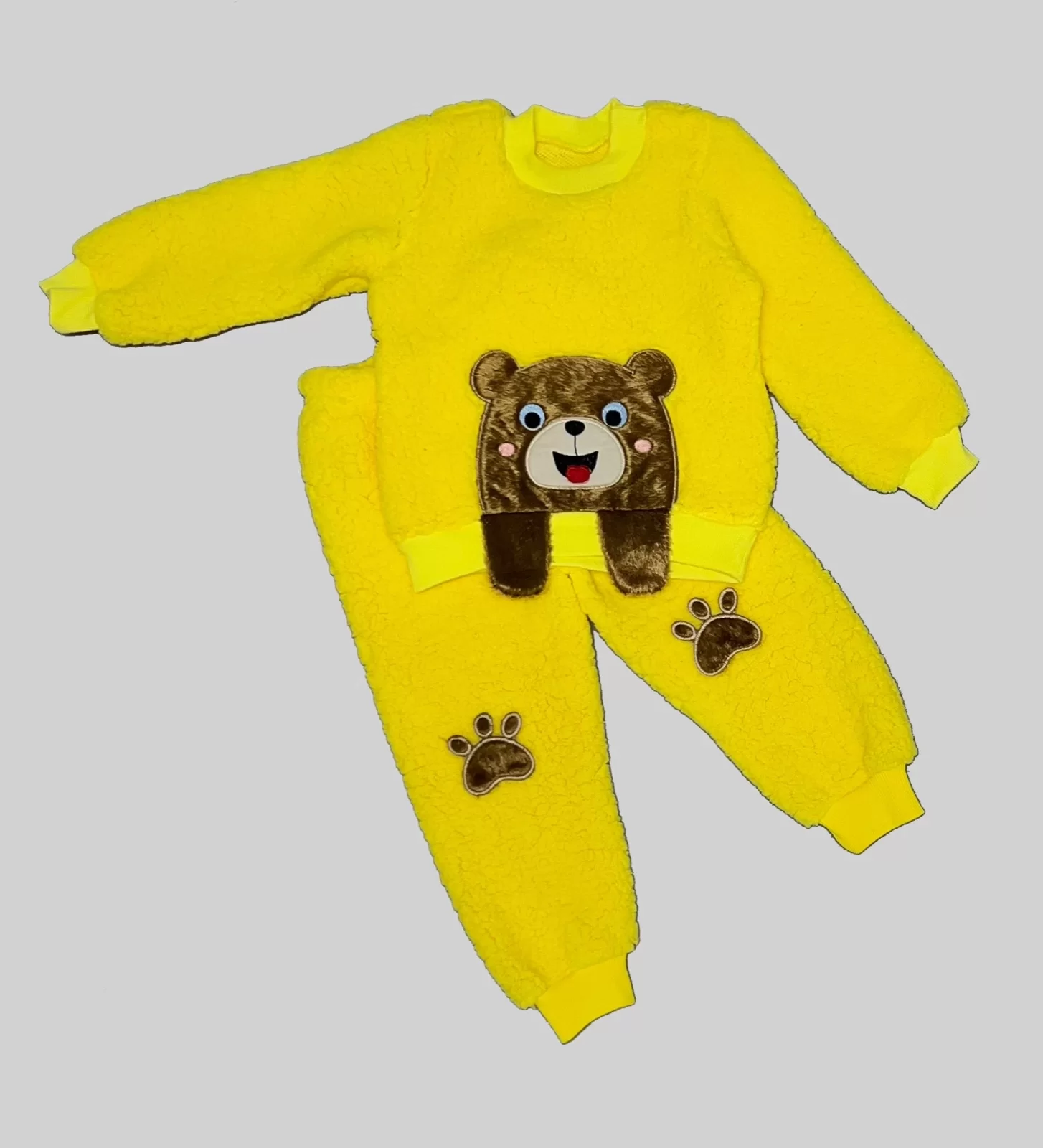 1-2-3 Yaş Sallanan El Ayıcıklı Kuzu Kumaş Sweat Patili Pantolon Uzun Kollu Kız Erkek 2 Li Takımı Sarı