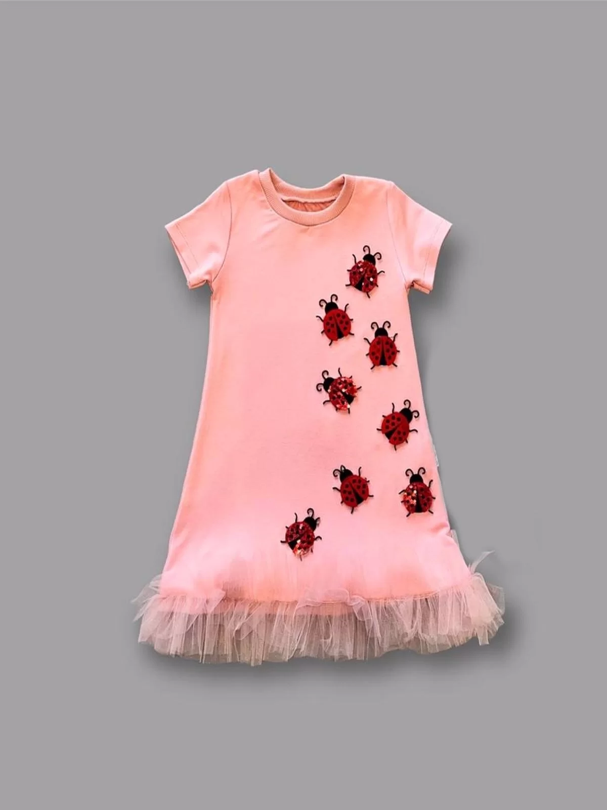 1-2-3 Yaş Uğur Böceği Nakışlı Fırfır Uçlu Kız Çocuk Jile Elbisesi