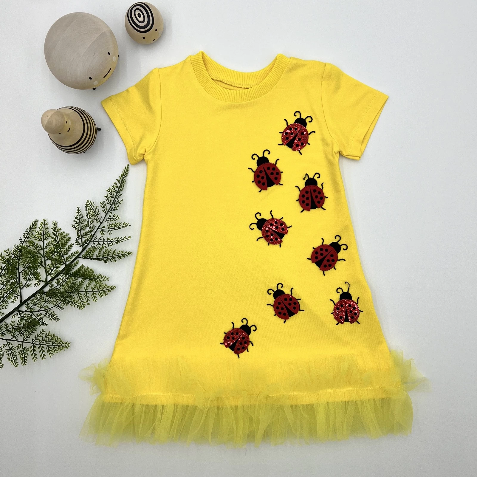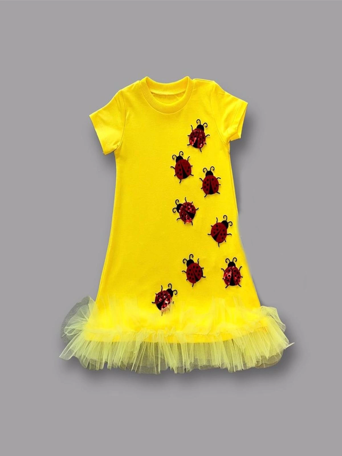 1-2-3 Yaş Uğur Böceği Nakışlı Fırfır Uçlu Kız Çocuk Jile Elbisesi Sarı