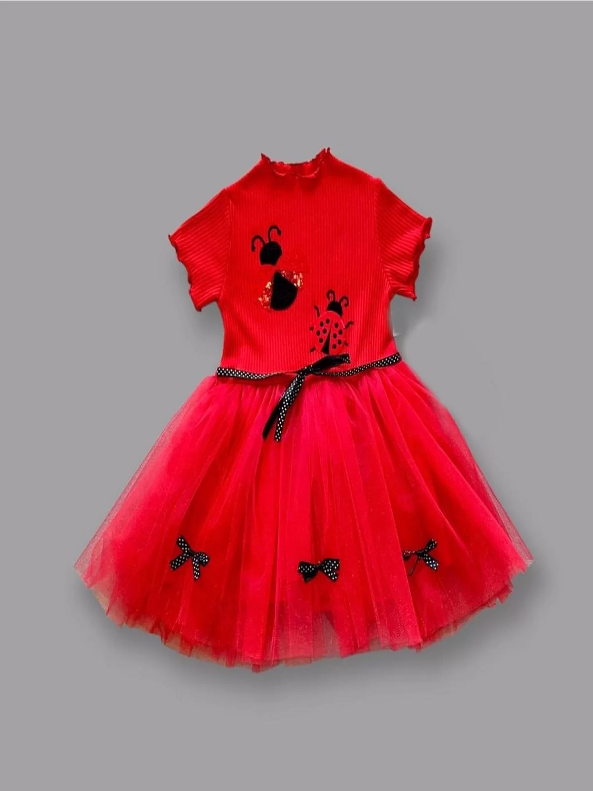 1-2-3 Yaş Uğur Böceği Nakışlı Kurdela Kuşak Kız Çocuk Elbisesi