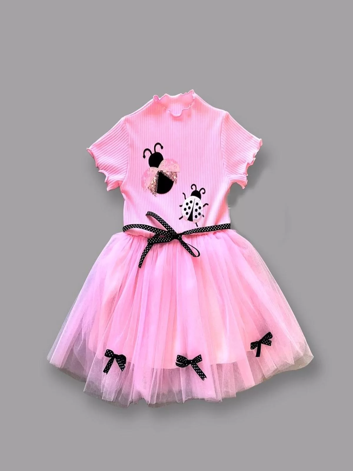 1-2-3 Yaş Uğur Böceği Nakışlı Kurdela Kuşak Kız Çocuk Elbisesi Pembe