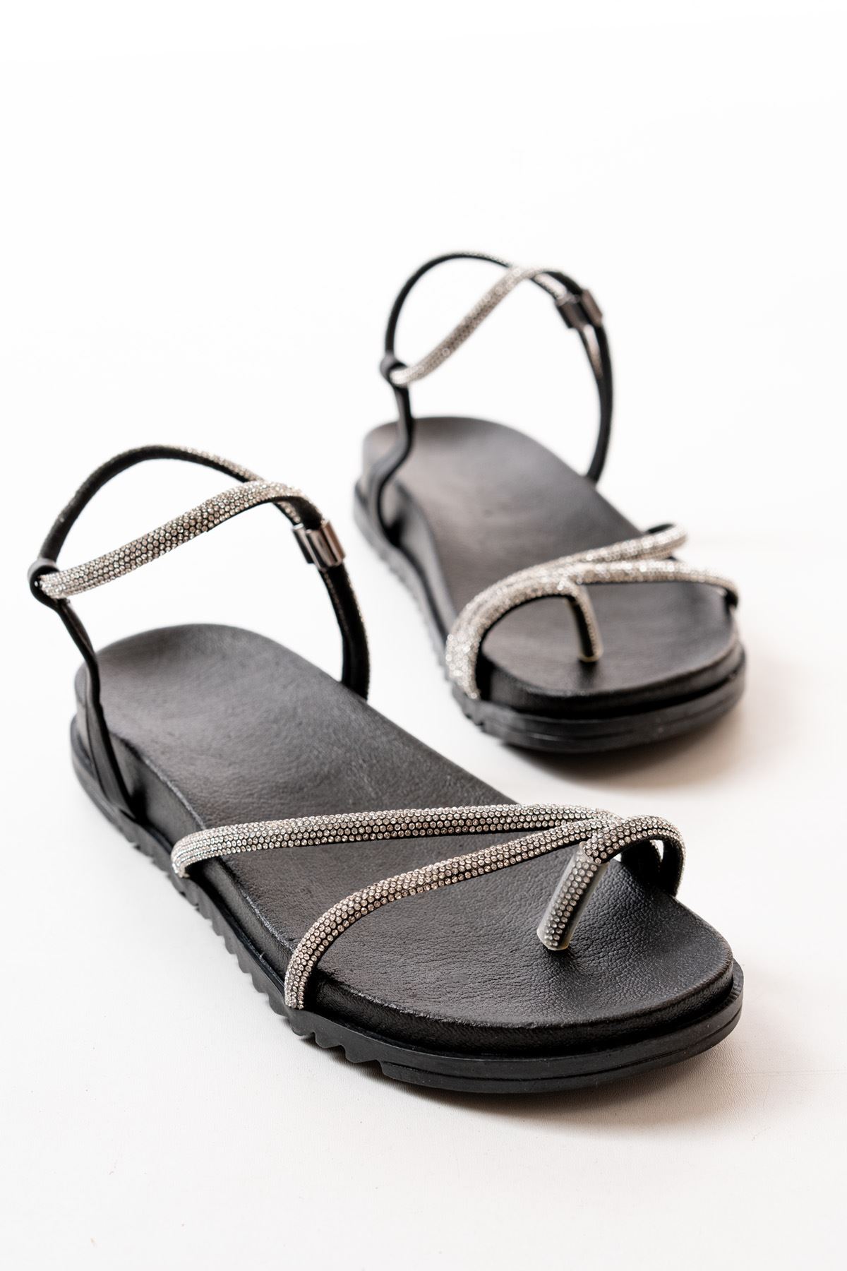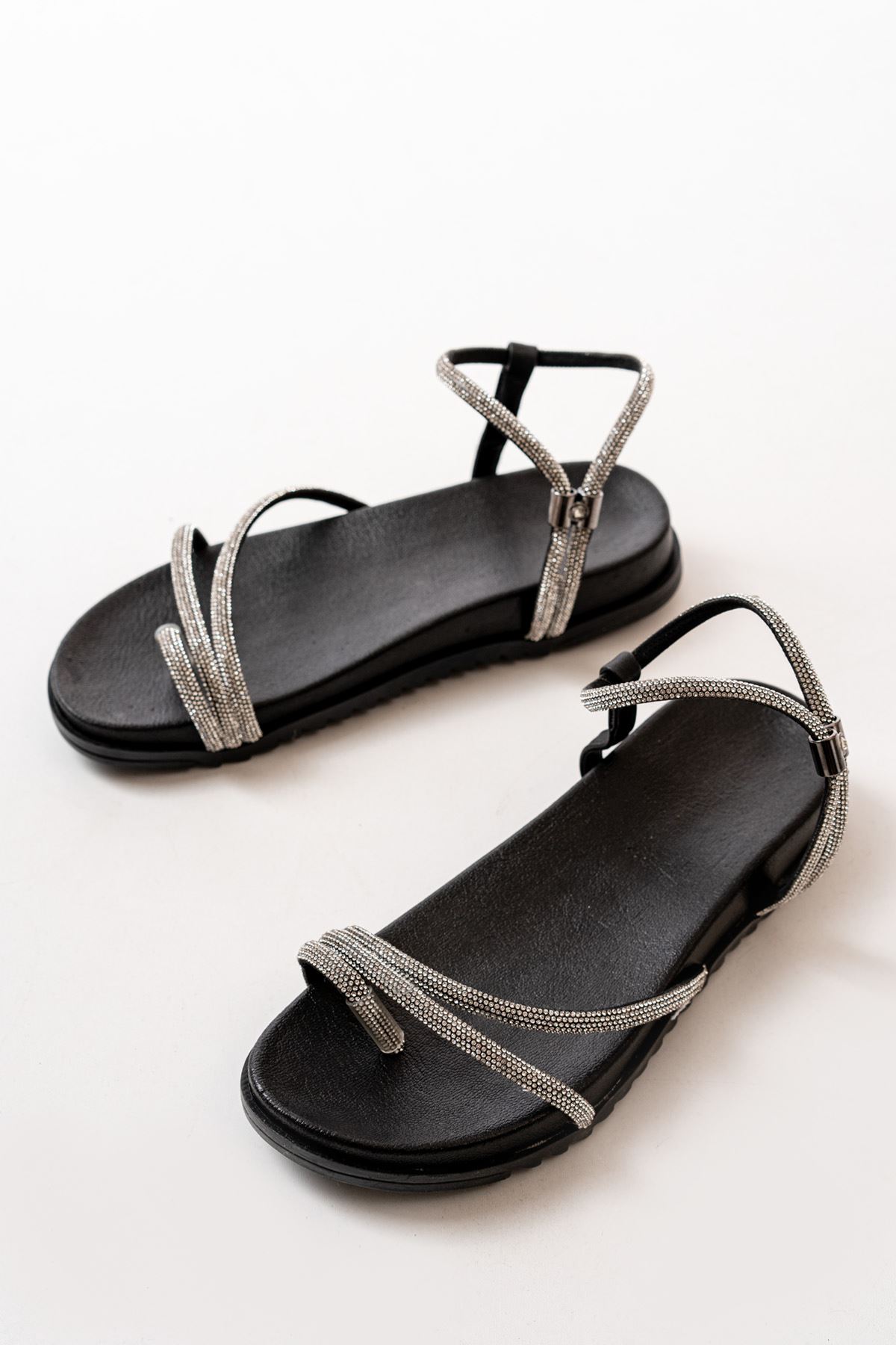 1001-1101 Siyah Gümüş Taşlı Günlük Kadın Sandalet