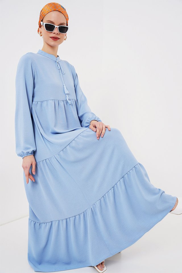 1627 Yaka Bağcıklı Tesettür Elbise – Koyu Mavi