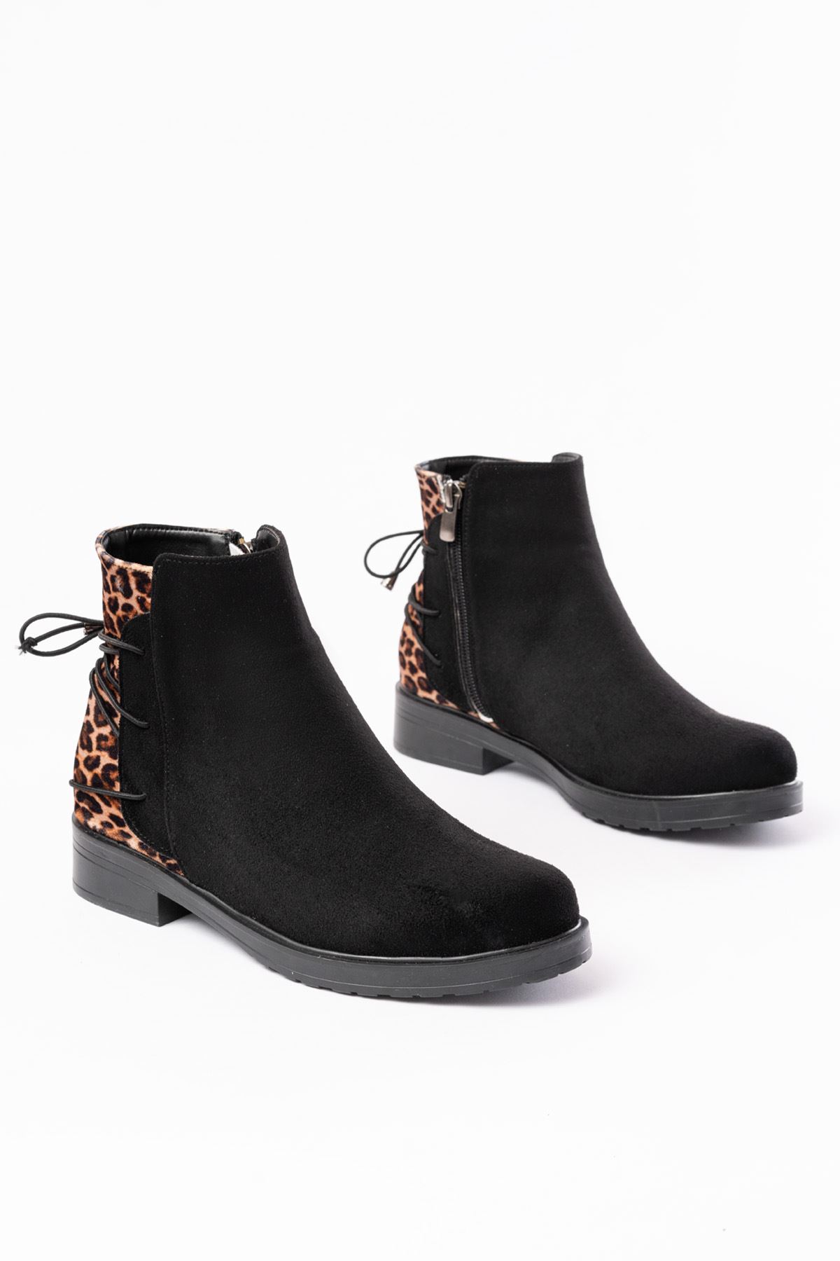 165-209 Siyah Leopar Arka Bağcık Aksesuarlı Fermuarlı Günlük Kadın Bot