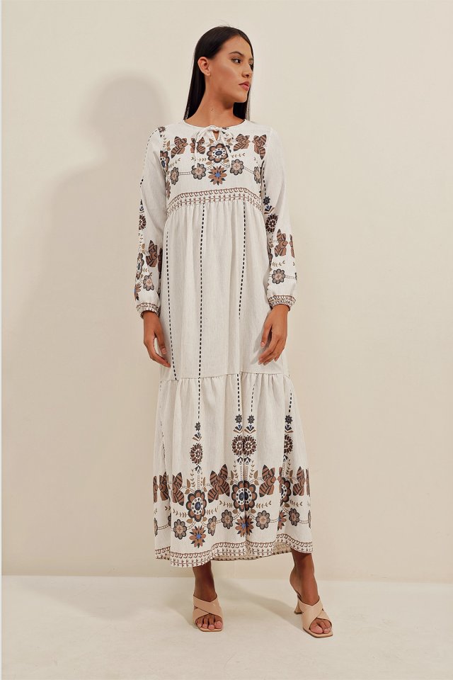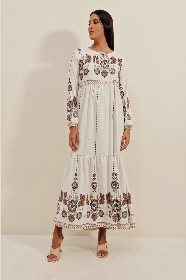 1947 Desenli Uzun Keten Elbise – Y.Kahve