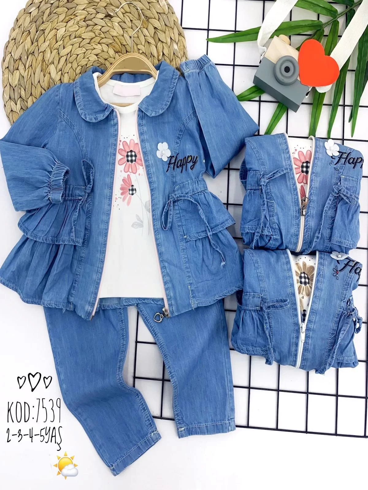 2-3-4-5 Fermuarlı Kot Ceket Kot Pantolon Sweatli 3 Lü Kız Çocuk Takımı Mavi adet