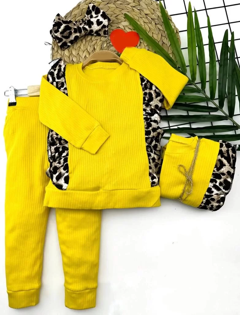 2-3-4-5 Yaş Bandanalı Leopar Baskılı Uzun Kollu 2li Kız Çocuk Takımı Sarı adet