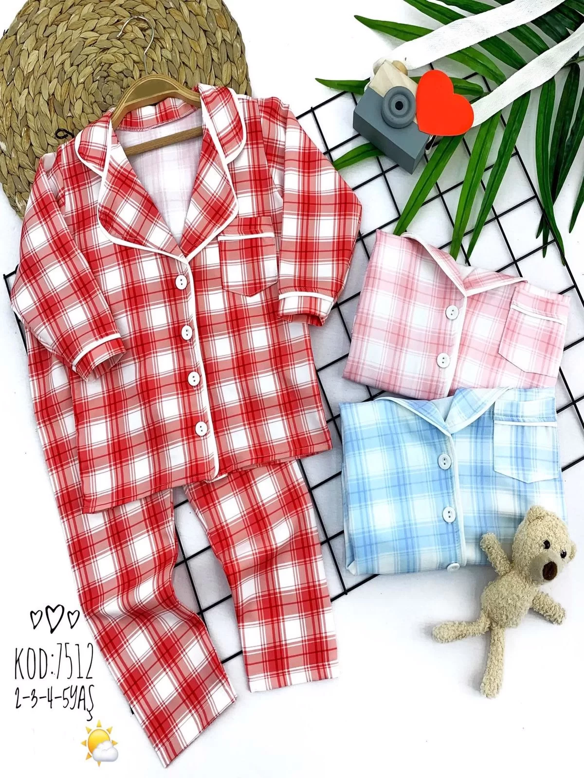 2-3-4-5 Yaş Düğme Kapamalı Ekose Desenli 2li Kız Erkek Çocuk Pijama Takımı Kırmızı