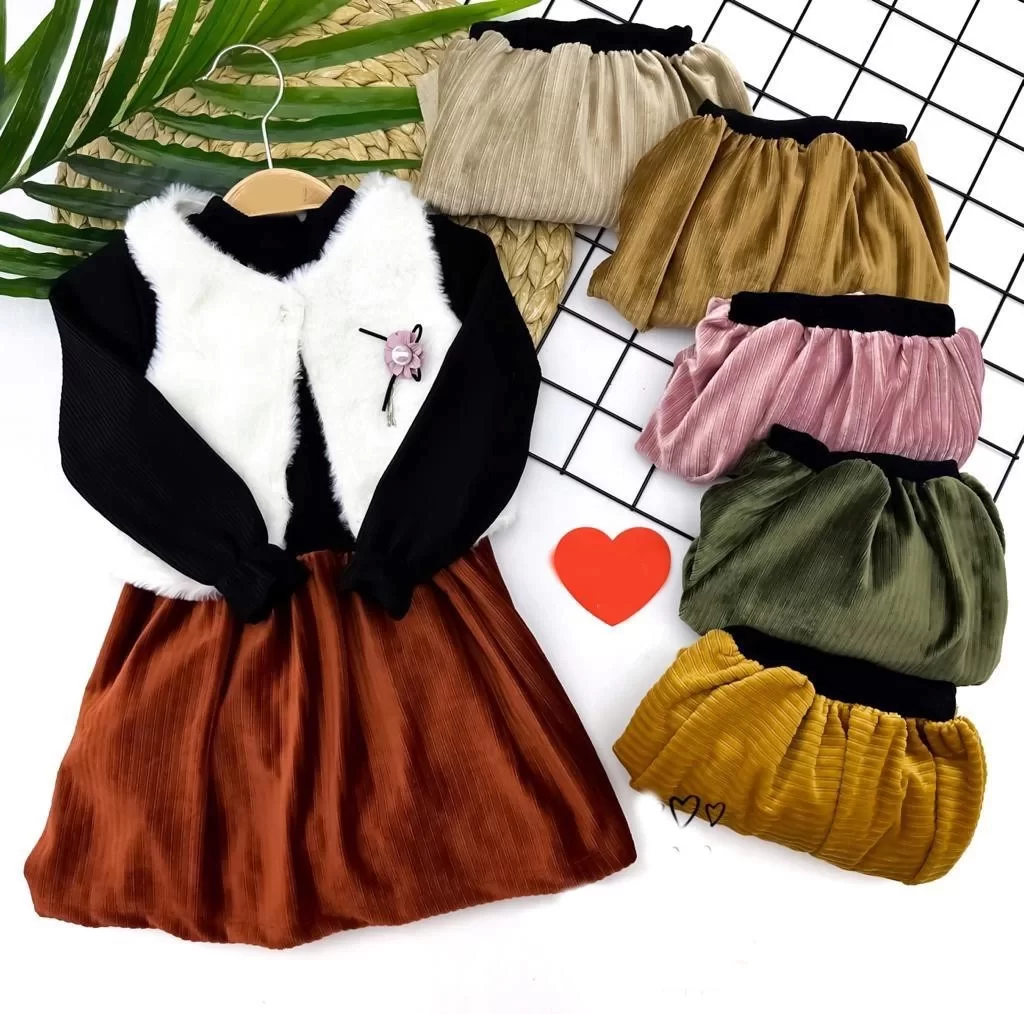 2-3-4-5 Yaş Kadife Etekli Tüylü Yelek Uzun Kollu Siyah Sweat 3lü Kız Bebek Takımı Pembe