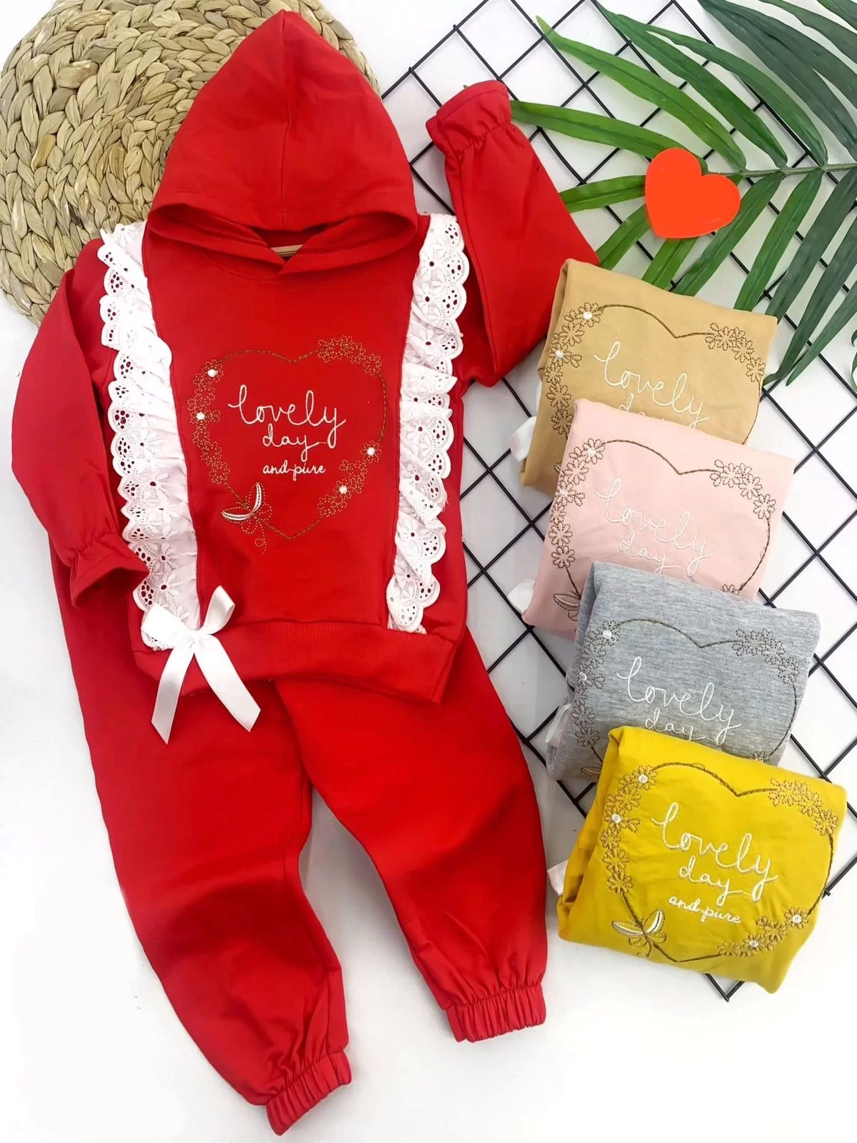 2-3-4-5 Yaş Kapşonlu Çift Fırfır Detaylı Uzun Kollu 2li Kız Çocuk Takımı Pembe adet