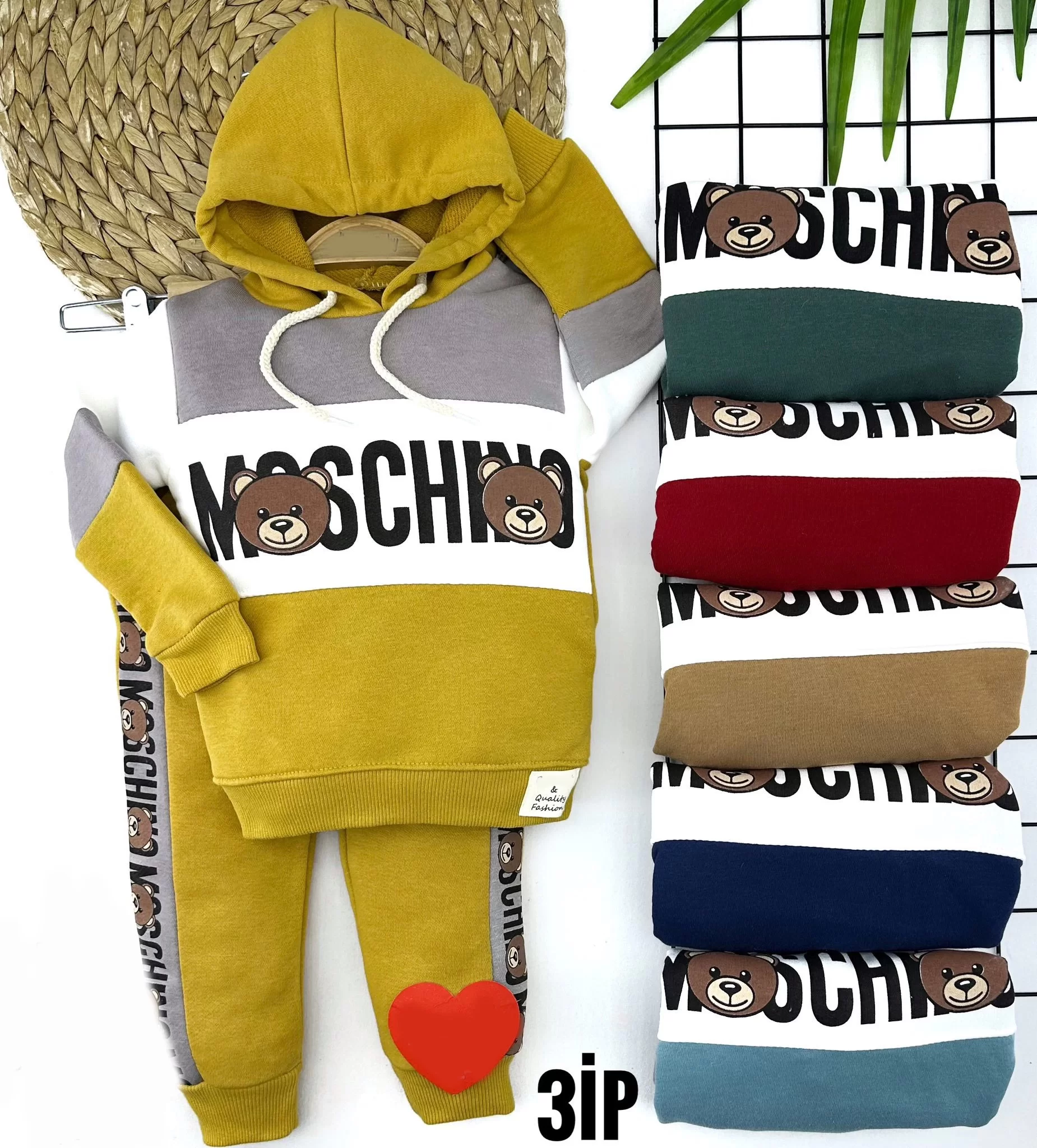 2-3-4-5 Yaş Kapşonlu İp Bağlamalı Ayıcık Baskılı Uzun Kollu 2li Kız Erkek Çocuk Takımı