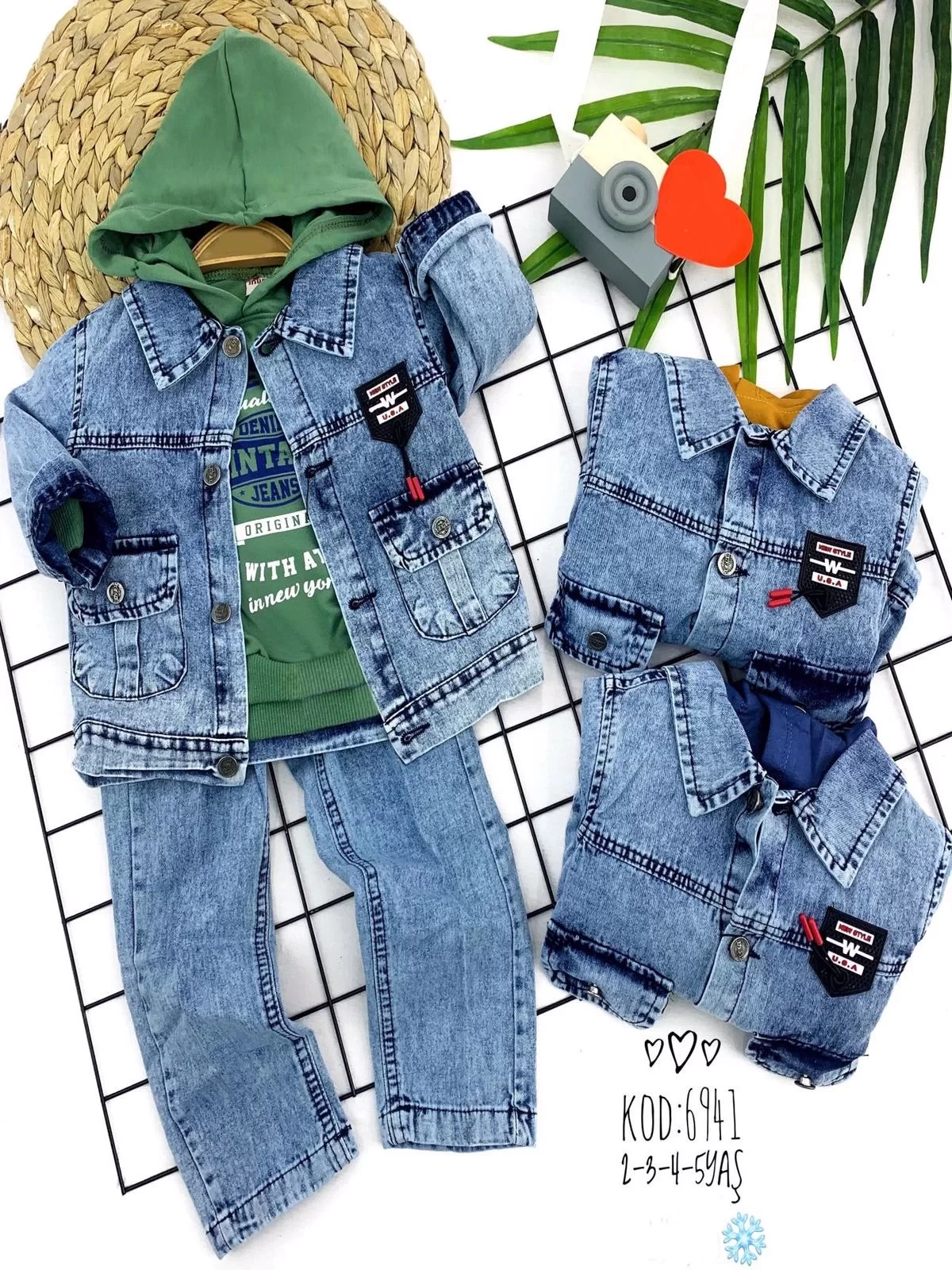 2-3-4-5 Yaş Kapşonlu Sweat Cepli Kot Ceket Ve Pantolonlu 3lü Erkek Bebek Takımı Yeşil