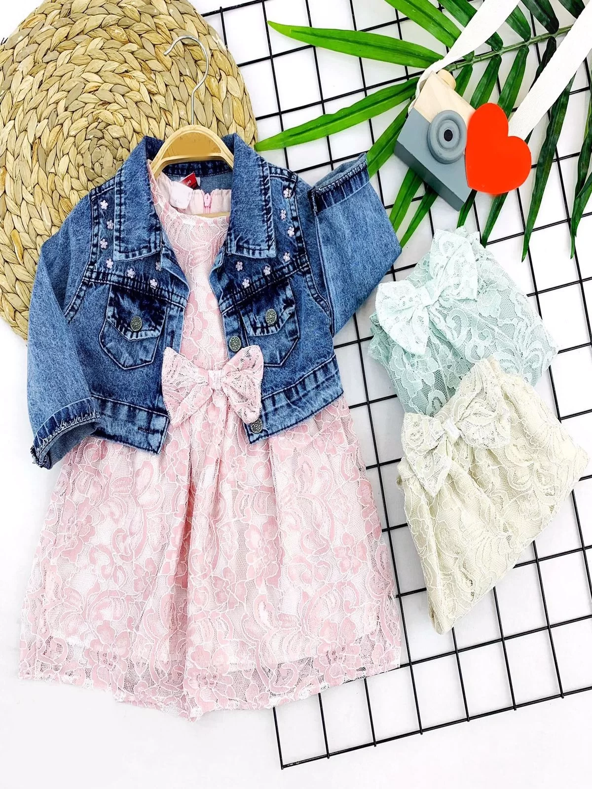 2-3-4-5 Yaş Kot Ceketli Astarlı Güpürlü 2li Kız Çocuk Elbisesi Krem adet