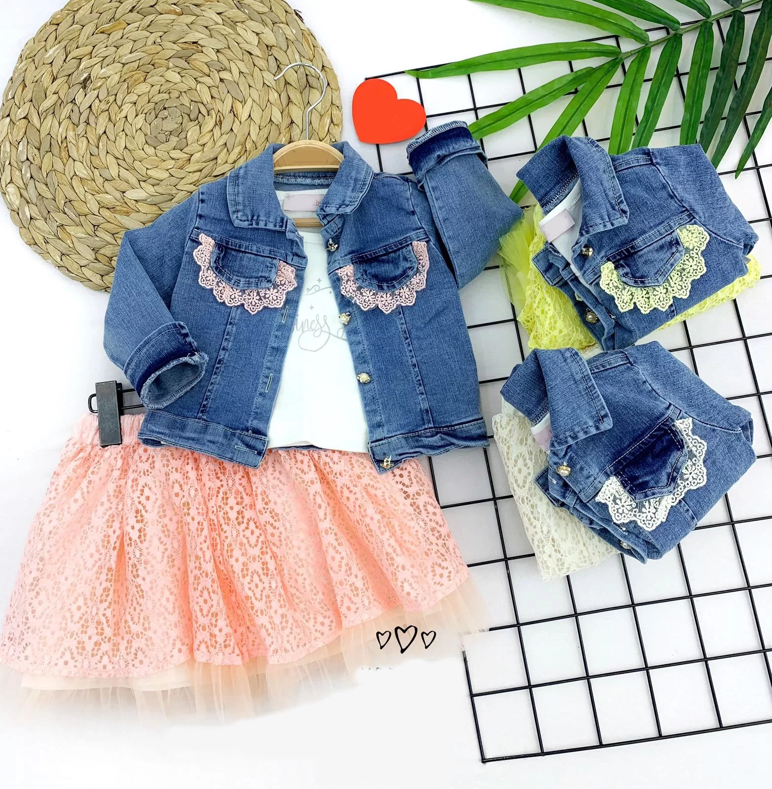 2-3-4-5 Yaş Kot Ceketli Astarlı Tül Etek 3lü Kız Çocuk Takımı Yeşil