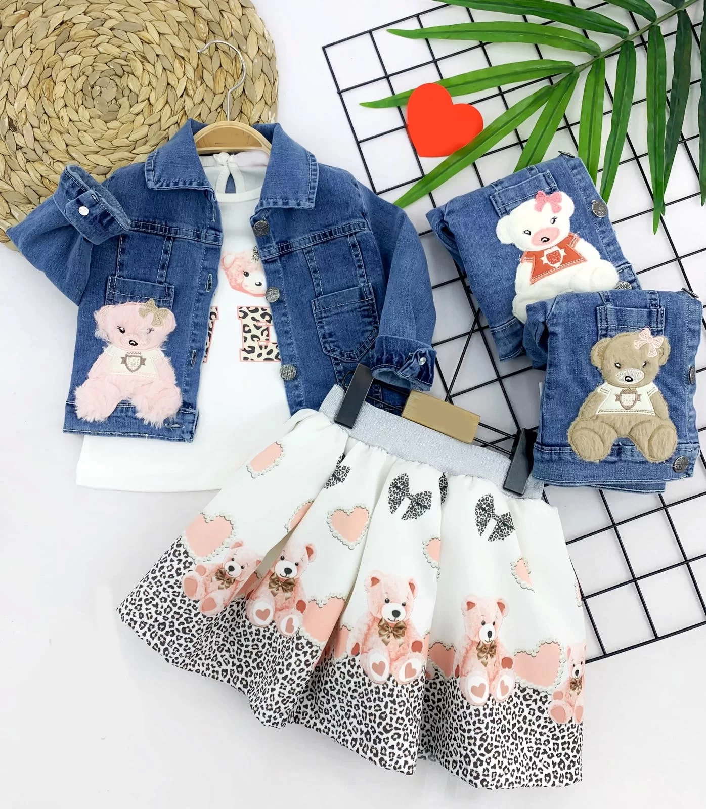 2-3-4-5 Yaş Kot Ceketli Fırfır Etekli 3lü Kız Çocuk Takımı Turuncu adet