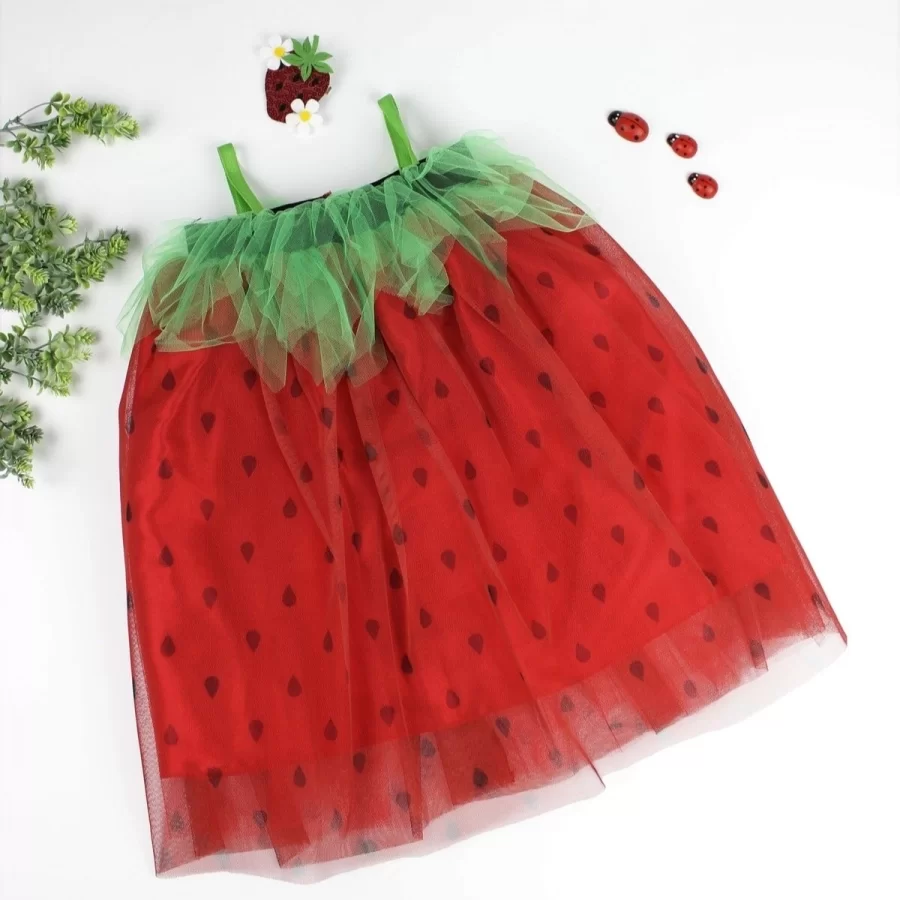 2-3-4 Yaş Askılı Çilek Kostüm Kız Çocuk Elbise Kırmızı adet