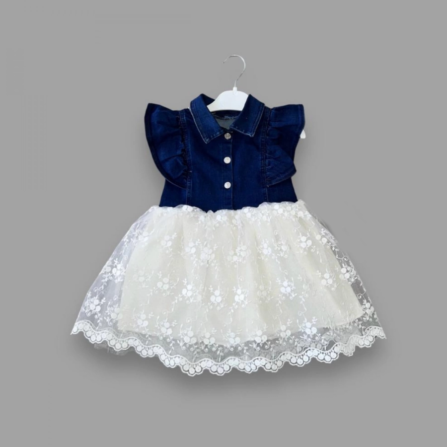 2-3-4 Yaş Astarlı Brode Etekli Kot Kumaş Düğmeli Kız Çocuk Elbisesi Mavi