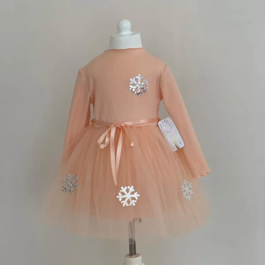 2-3-4 Yaş Kar Tanesi Desenli Kurdela Kuşaklı Astarlı Uzun Kollu Kız Çocuk Tütü Elbise
