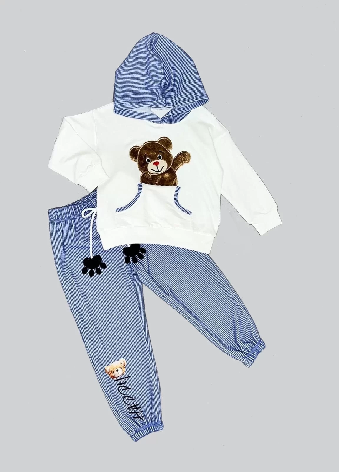 2-3-4 Yaş Pelüş Ayı Desenli Kapşonlu Uzun Kollu Penye Sweat 2li Erkek Çocuk Takımı