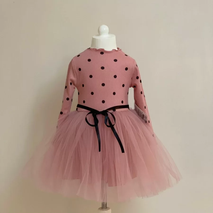 2-3-4 Yaş Puntiye Desenli Kurdela Kuşaklı Astarlı Uzun Kollu Kız Çocuk Tütü Elbise