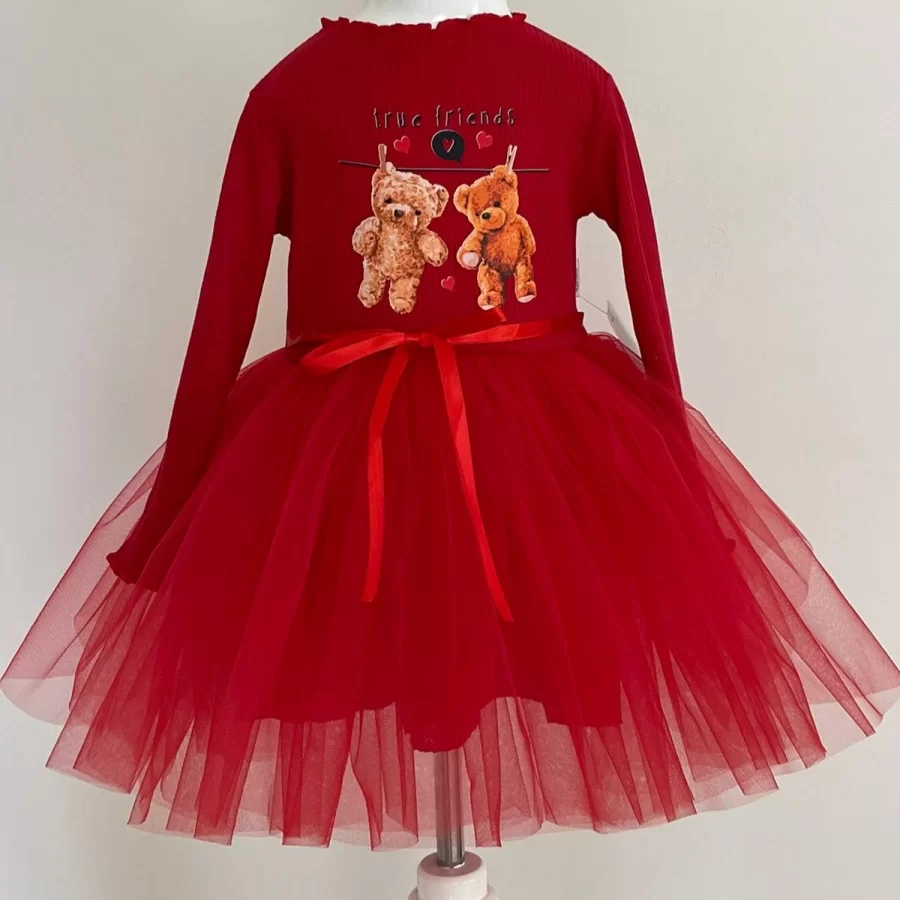 2-3-4 Yaş Şirin Ayılar Desenli Kurdela Kuşaklı Astarlı Uzun Kollu Kız Çocuk Tütü Elbise Kırmızı