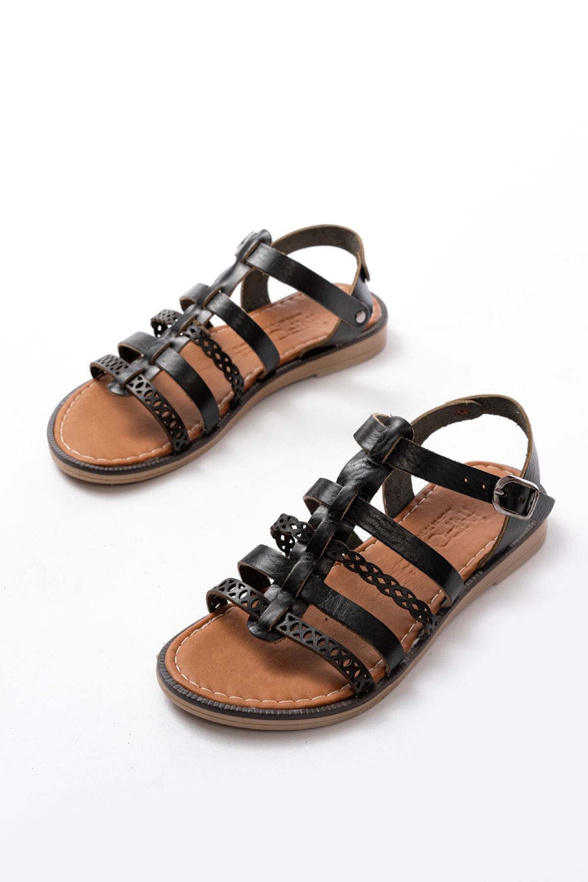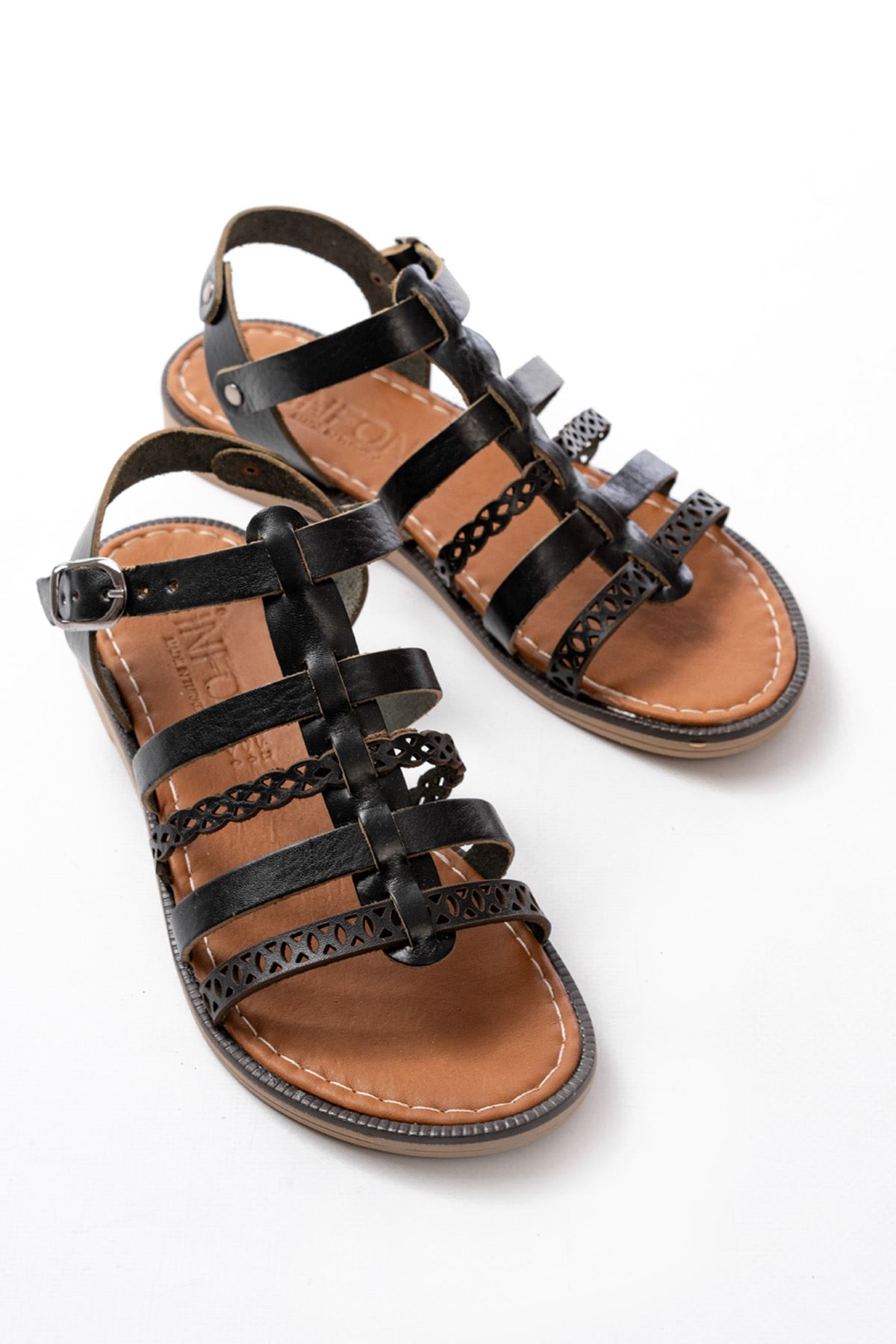205-014 Siyah Lazerli Kesim Hakiki Deri Ortopedik Taban Günlük Kadın Sandalet