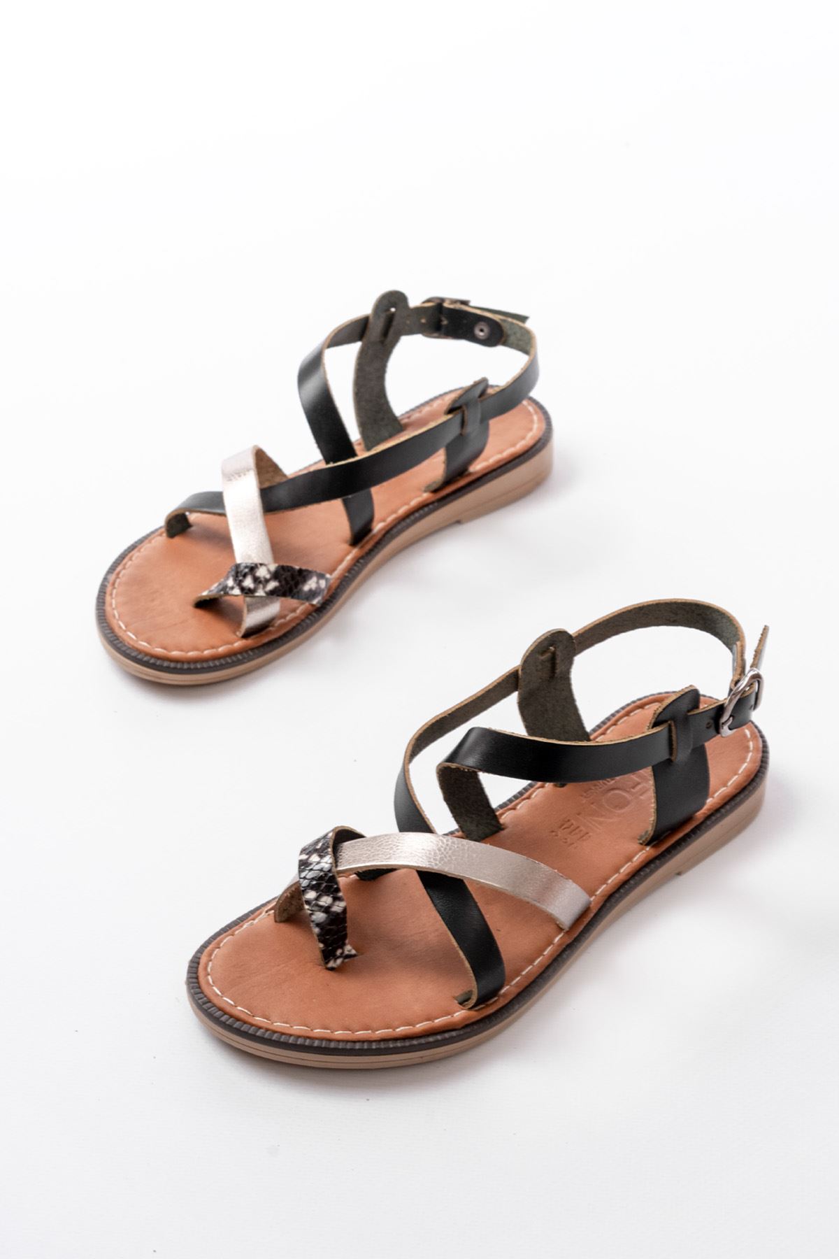 205-08 Siyah Garni Ortopedik Hakiki Deri Kadın Sandalet