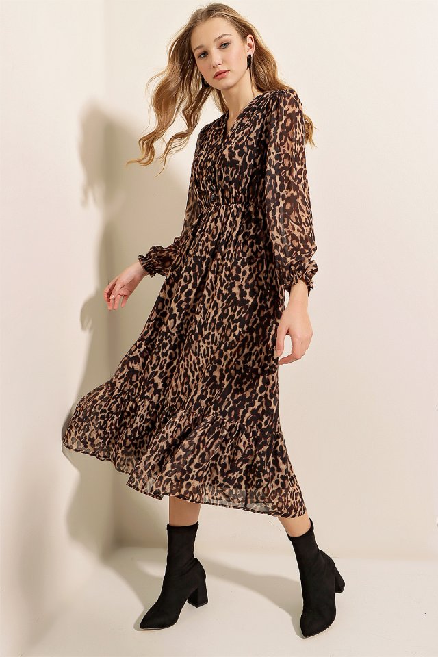 2137 Desenli Şifon Elbise – C. Kahverengi