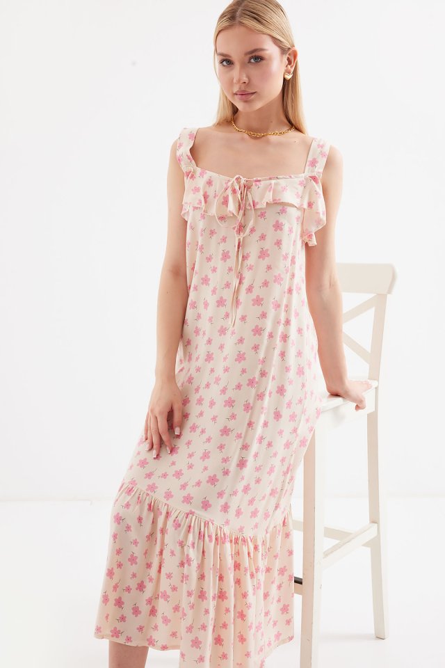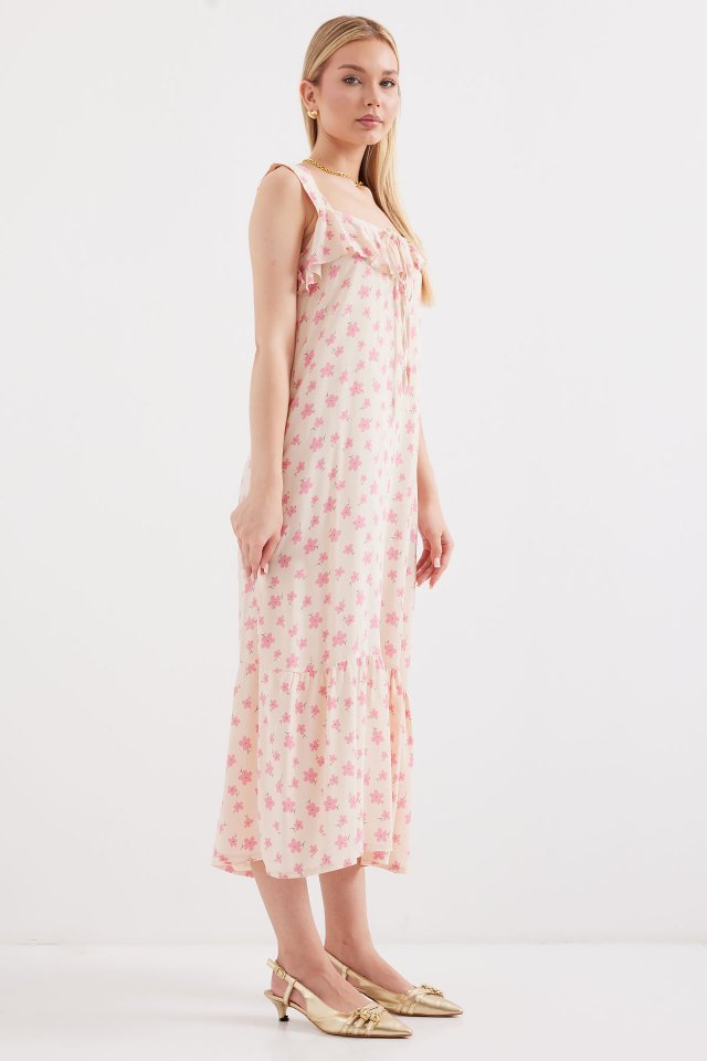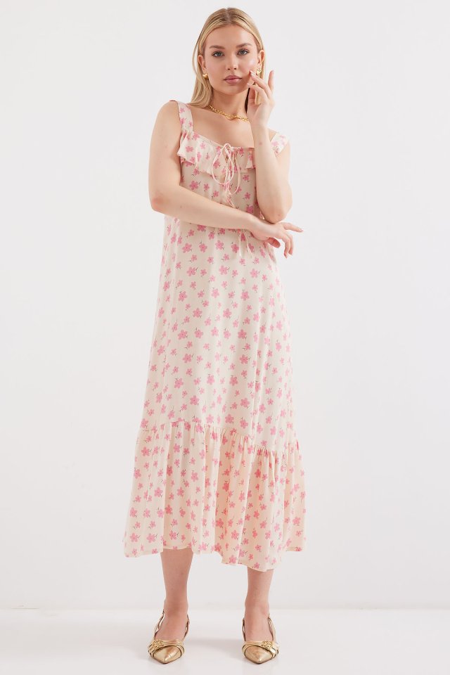 2237 Desenli Askılı Viskon Elbise – Pembe