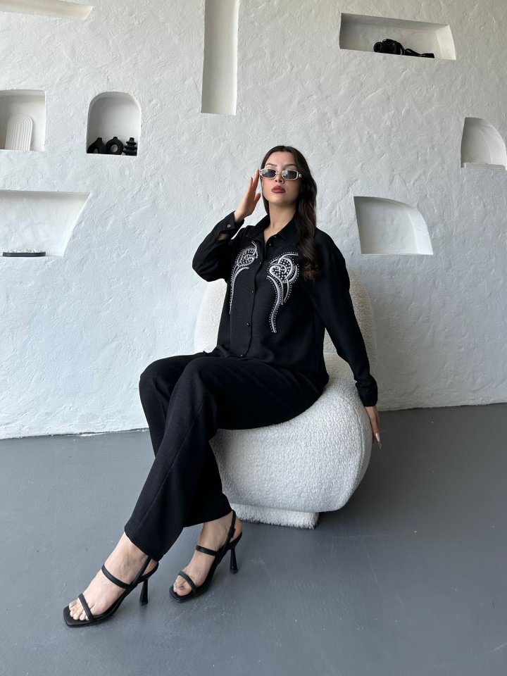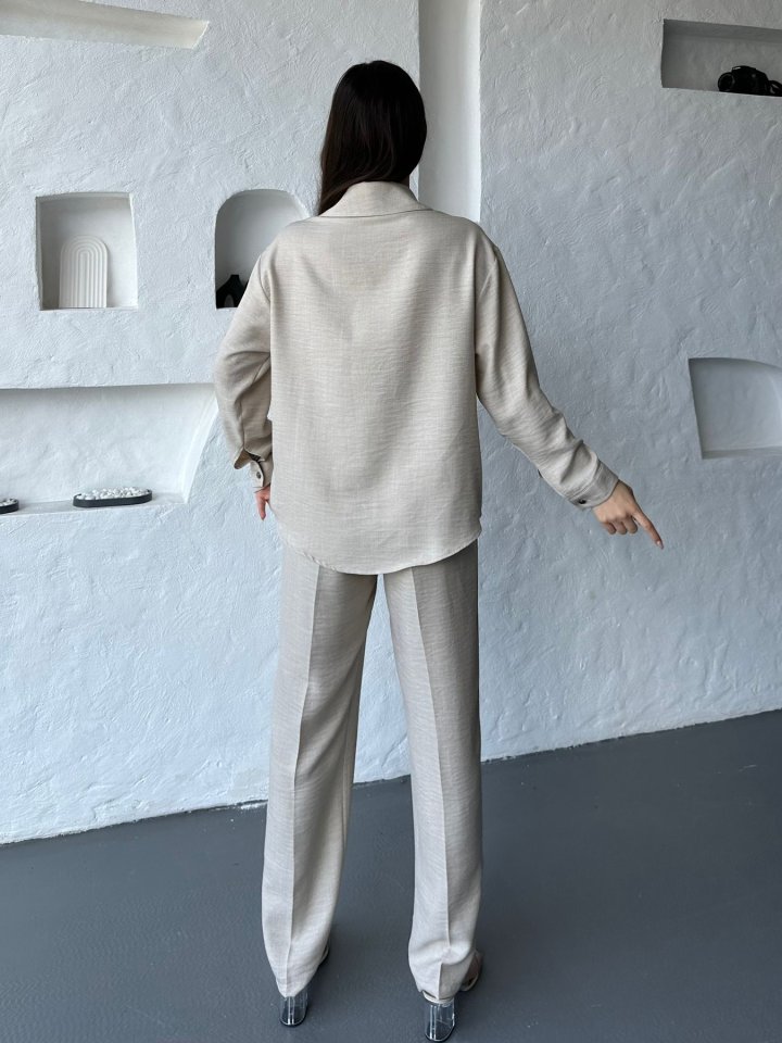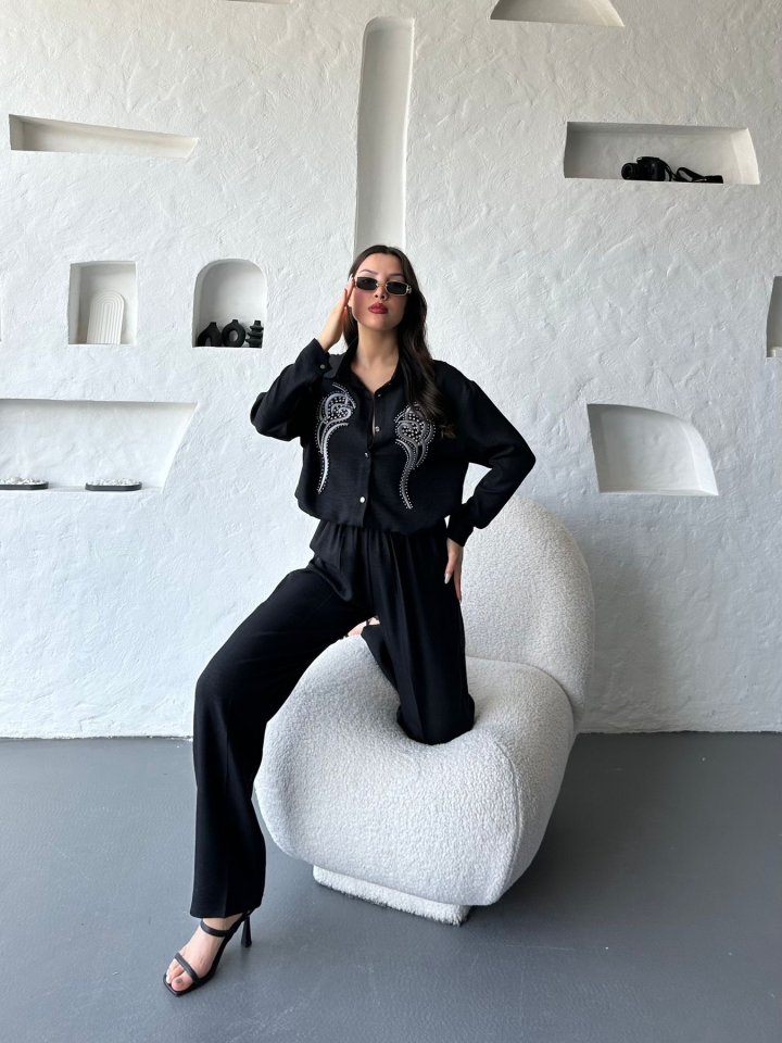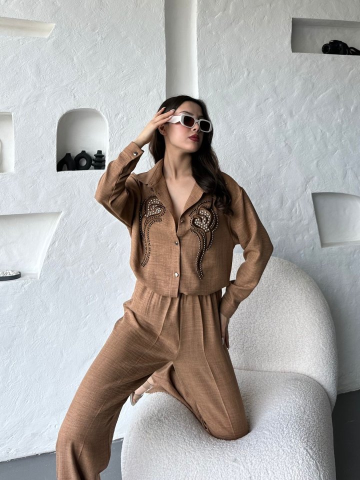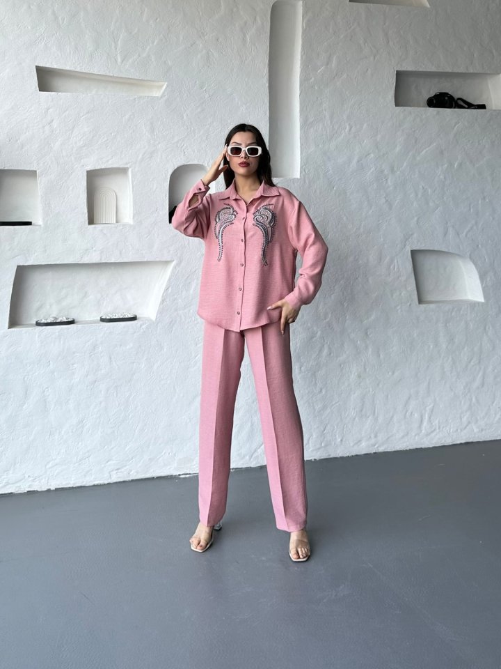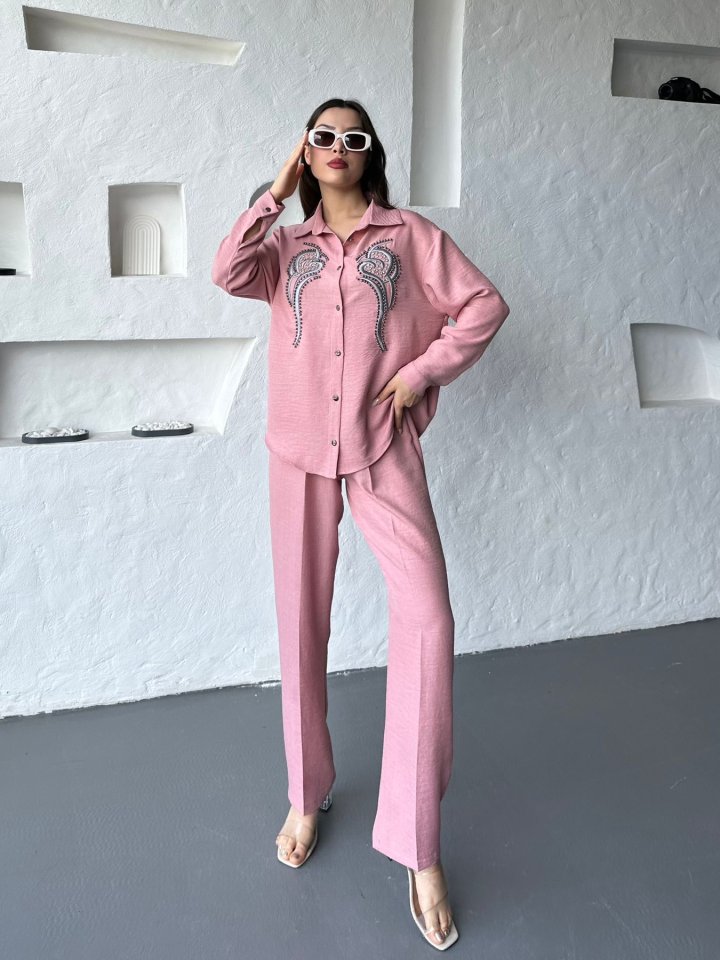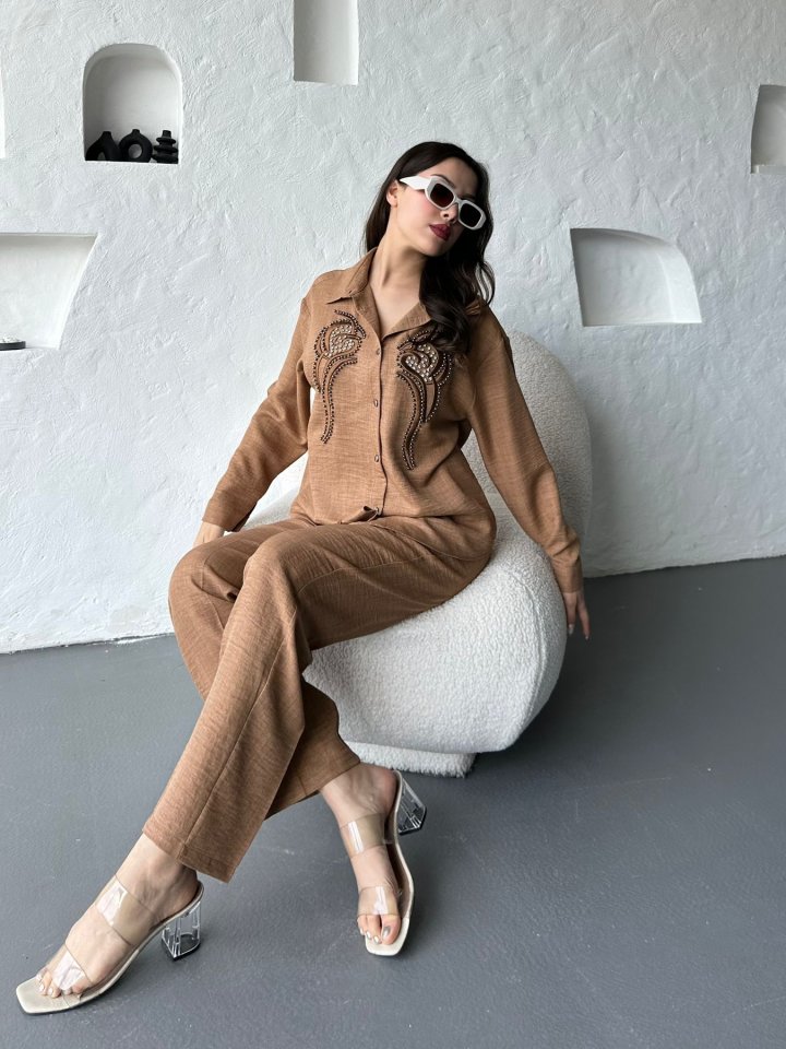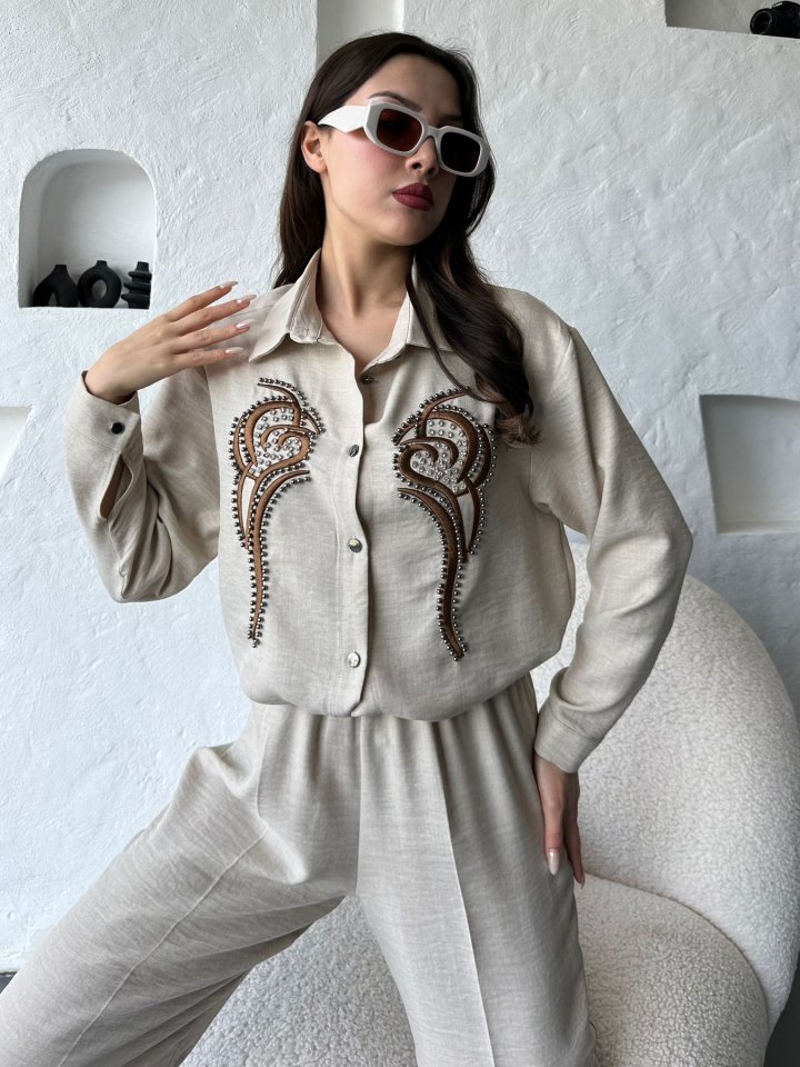 İşleme Detaylı Gömlek & Pantolon Keten İkili Takım
