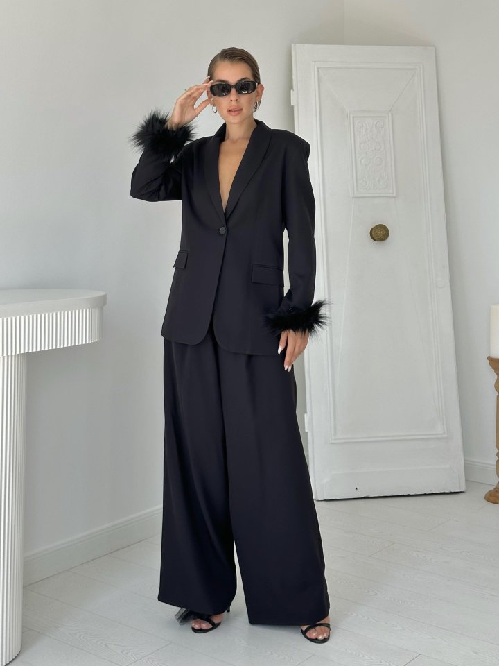 Siyah Kol Ucu Tüylü Ceket & Pantolon Takım
