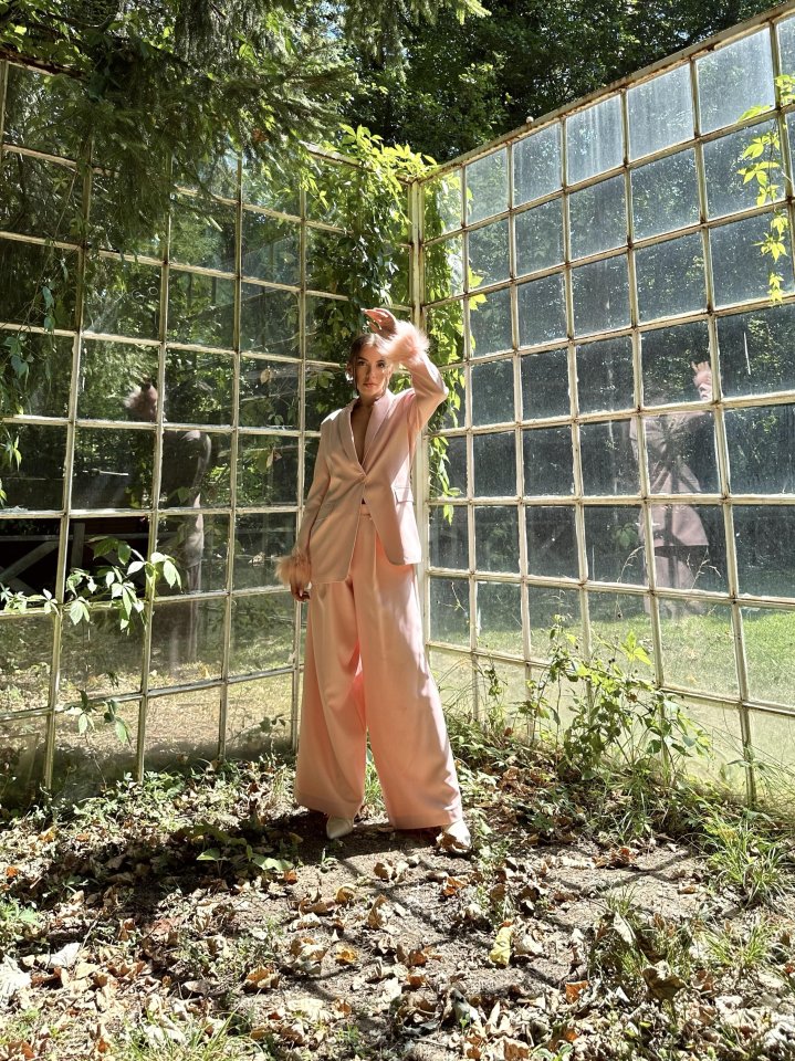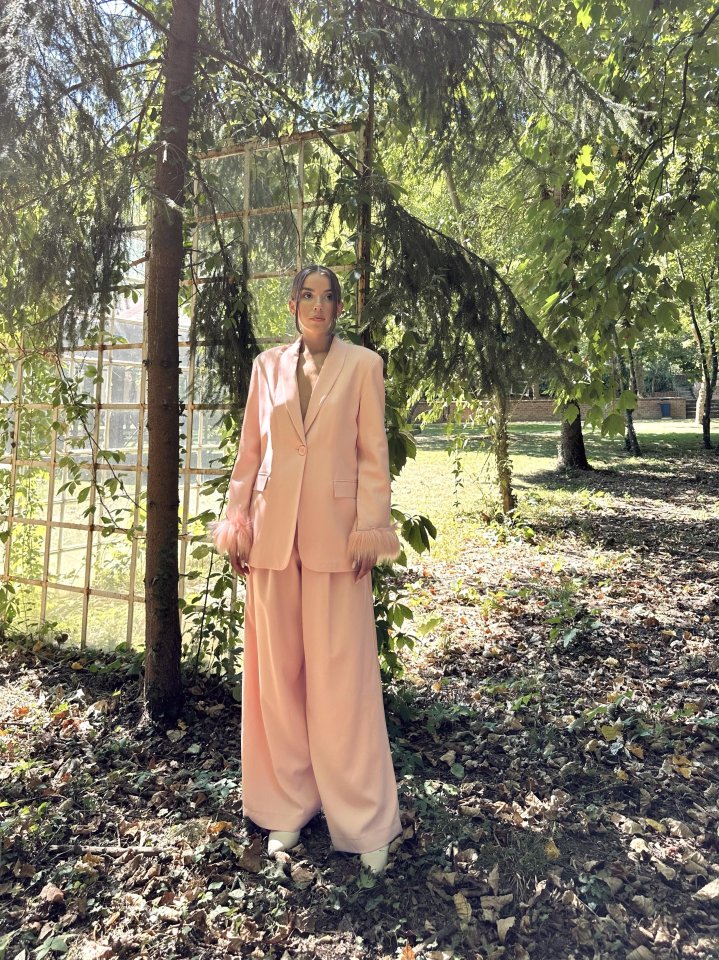 Pudra Kol Ucu Tüylü Ceket & Pantolon Takım