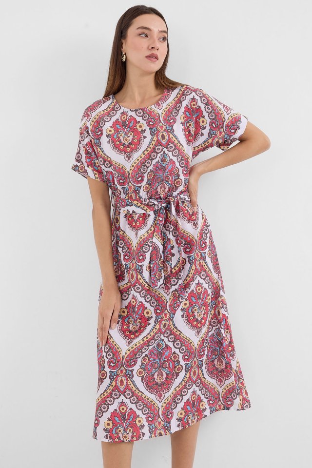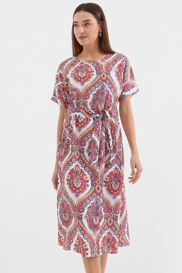 2389 Kemerli Keten Elbise – Nar
