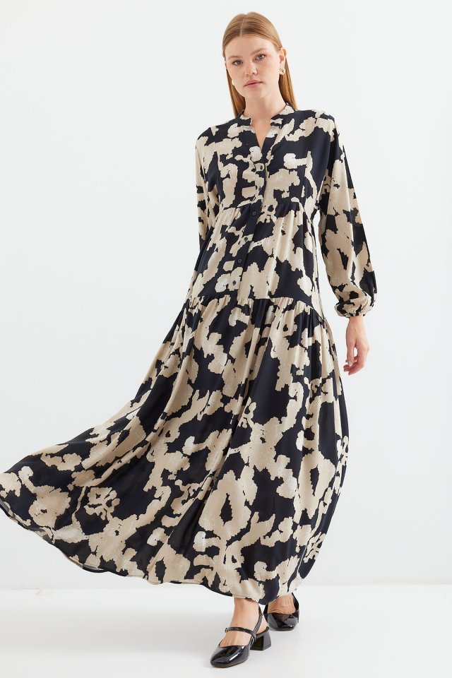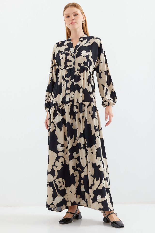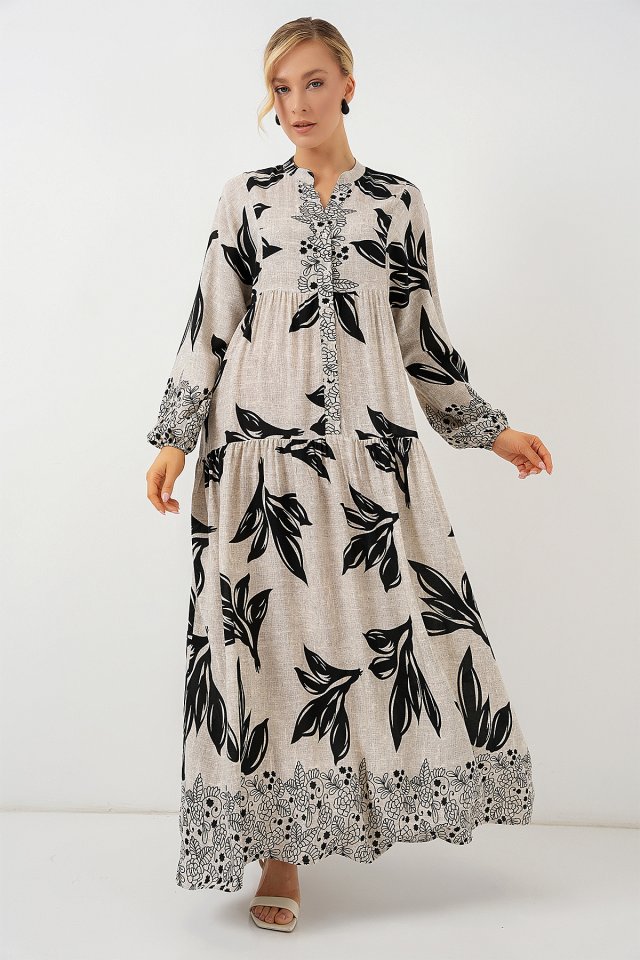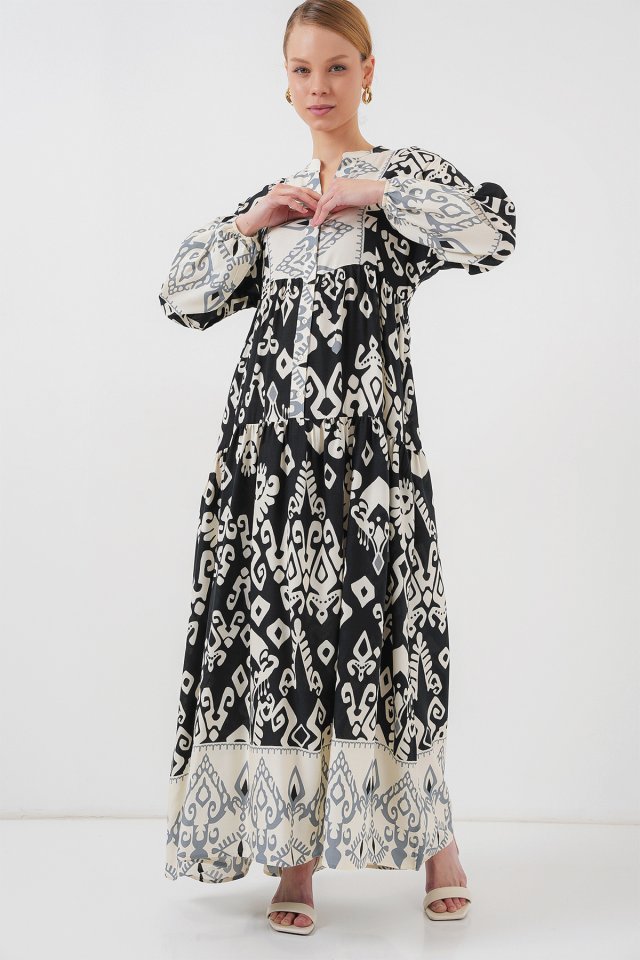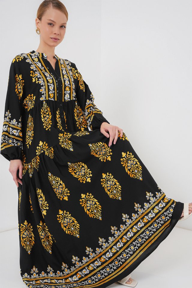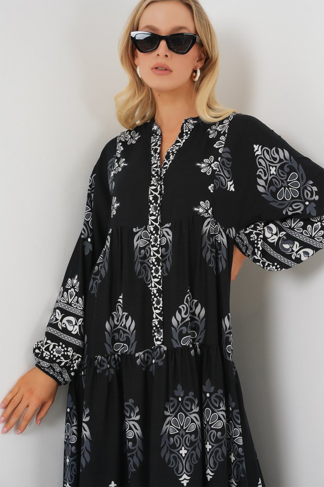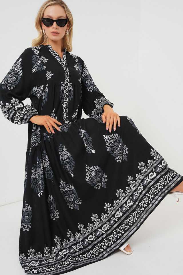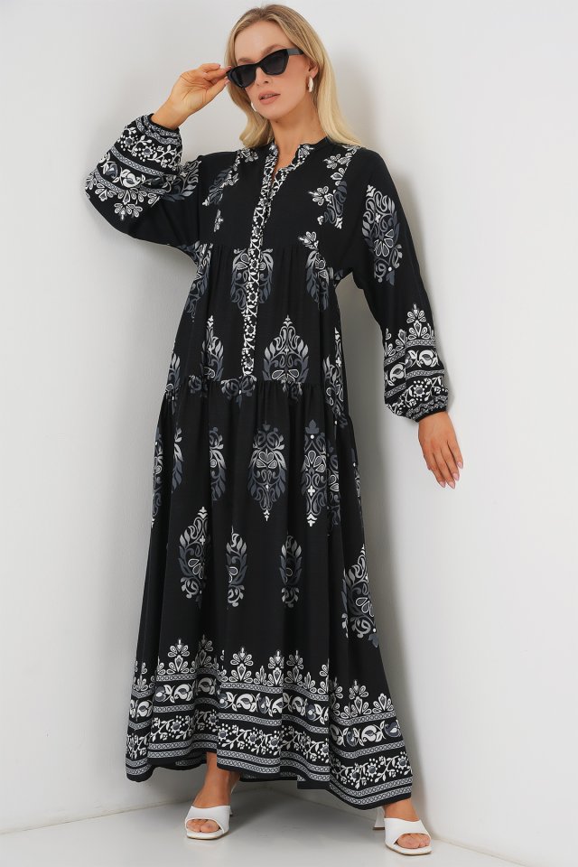 2423 Otantik Desenli Tesettür Elbise – Siyah 6
