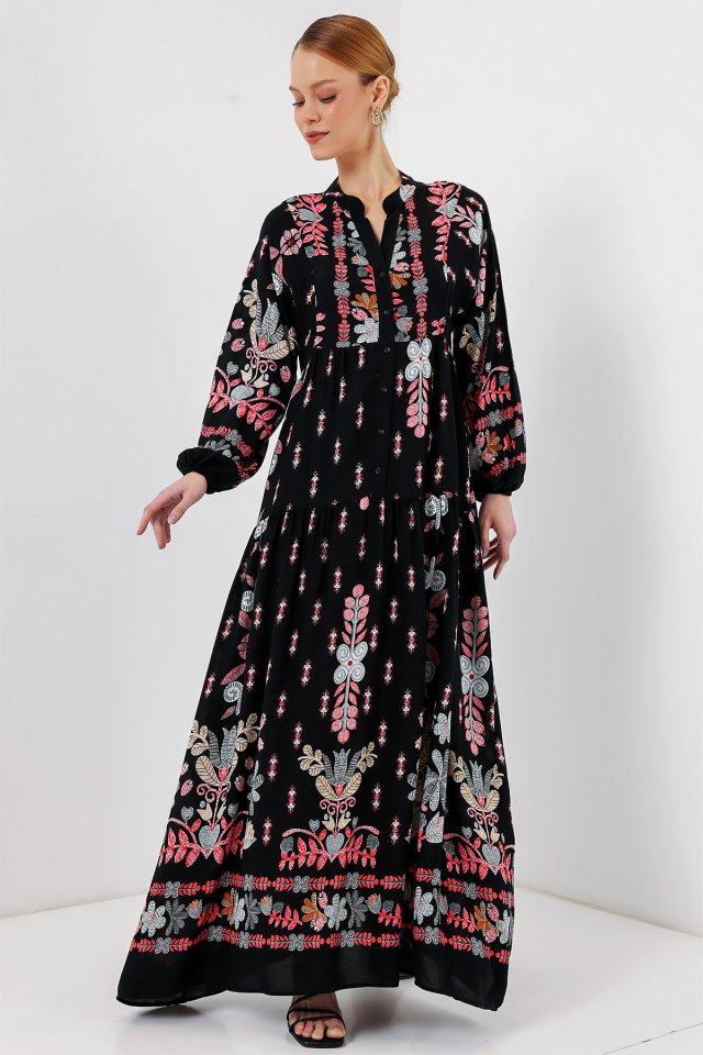 2423 Otantik Desenli Tesettür Elbise – Siyah – Kiremit