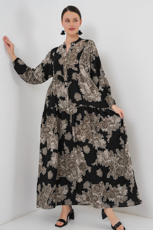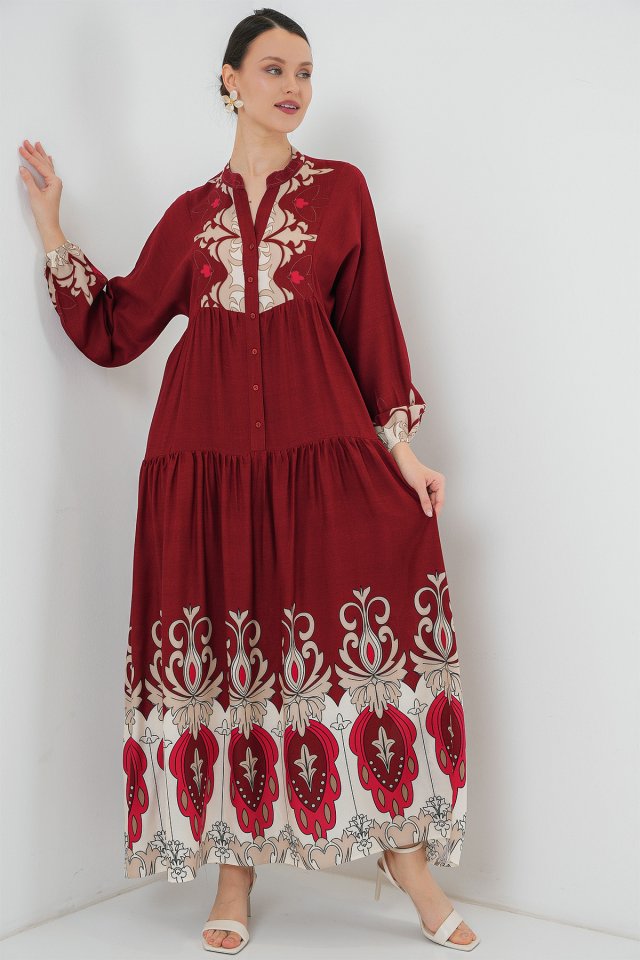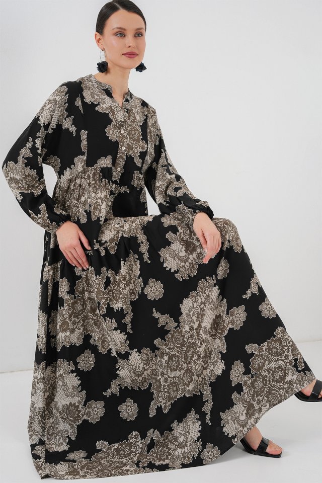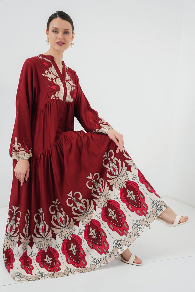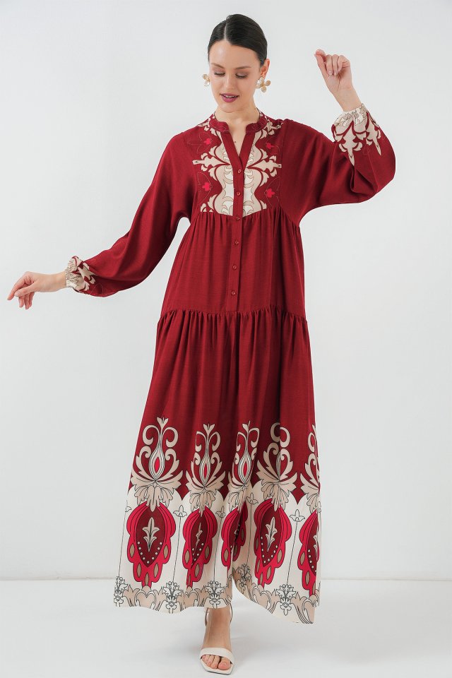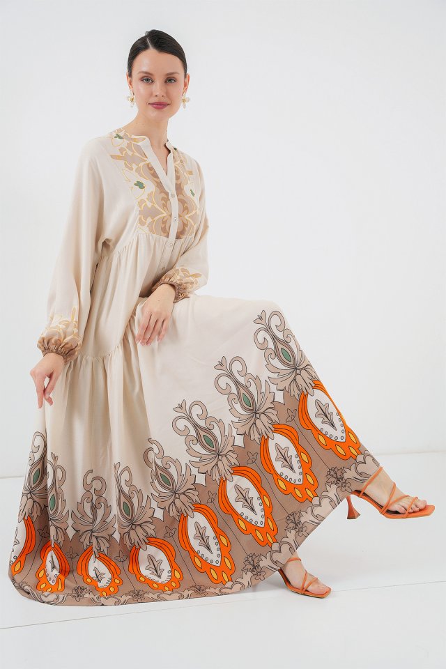 2423 Otantik Desenli Tesettür Elbise – T. Ekru