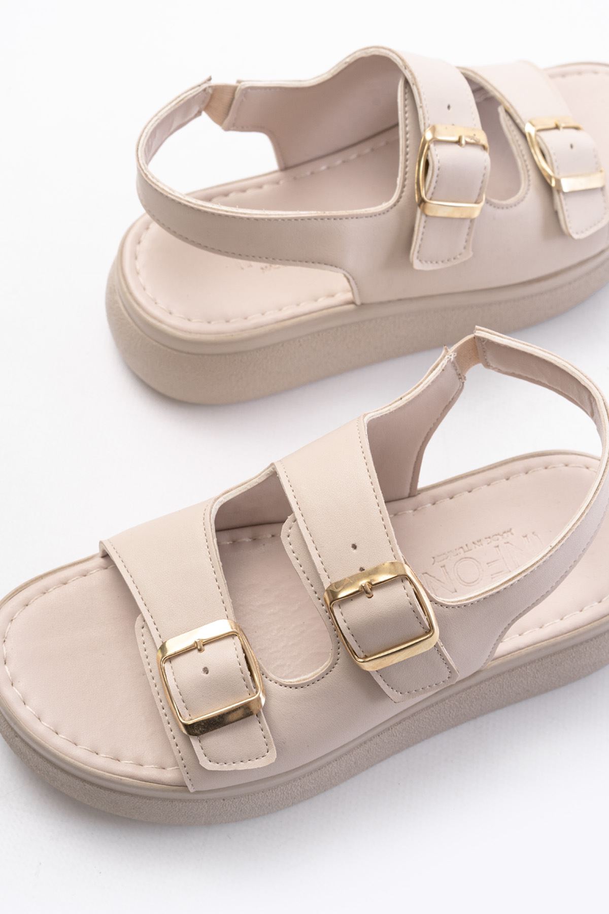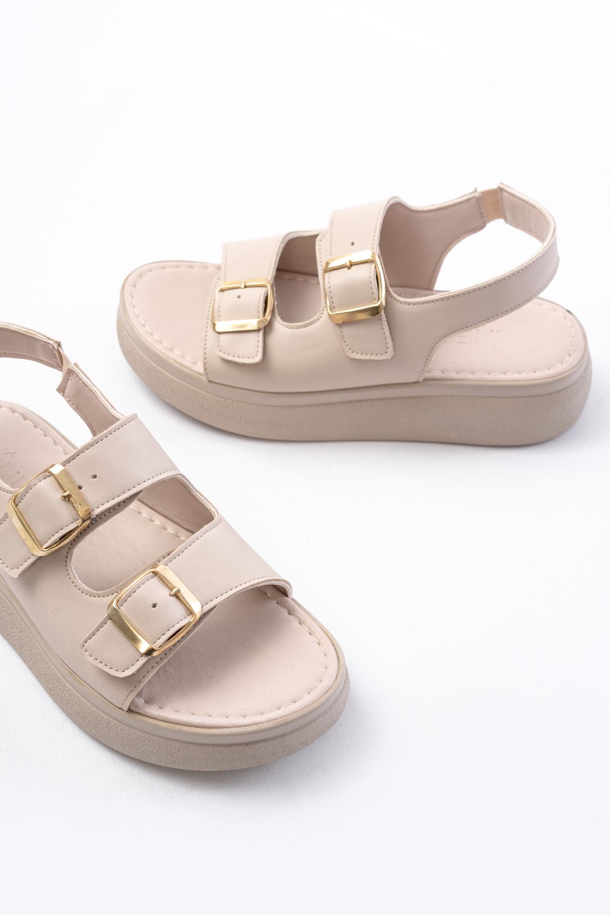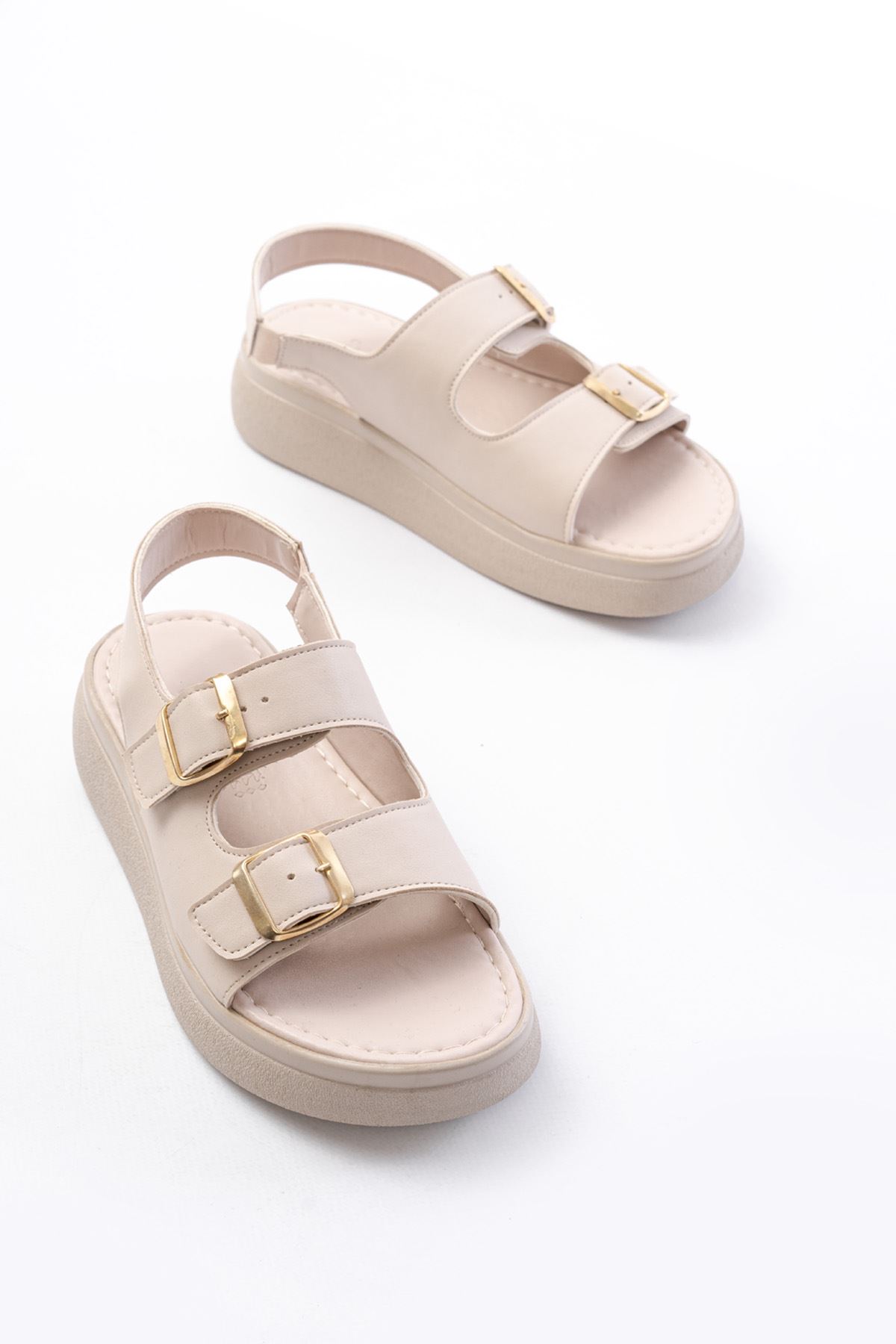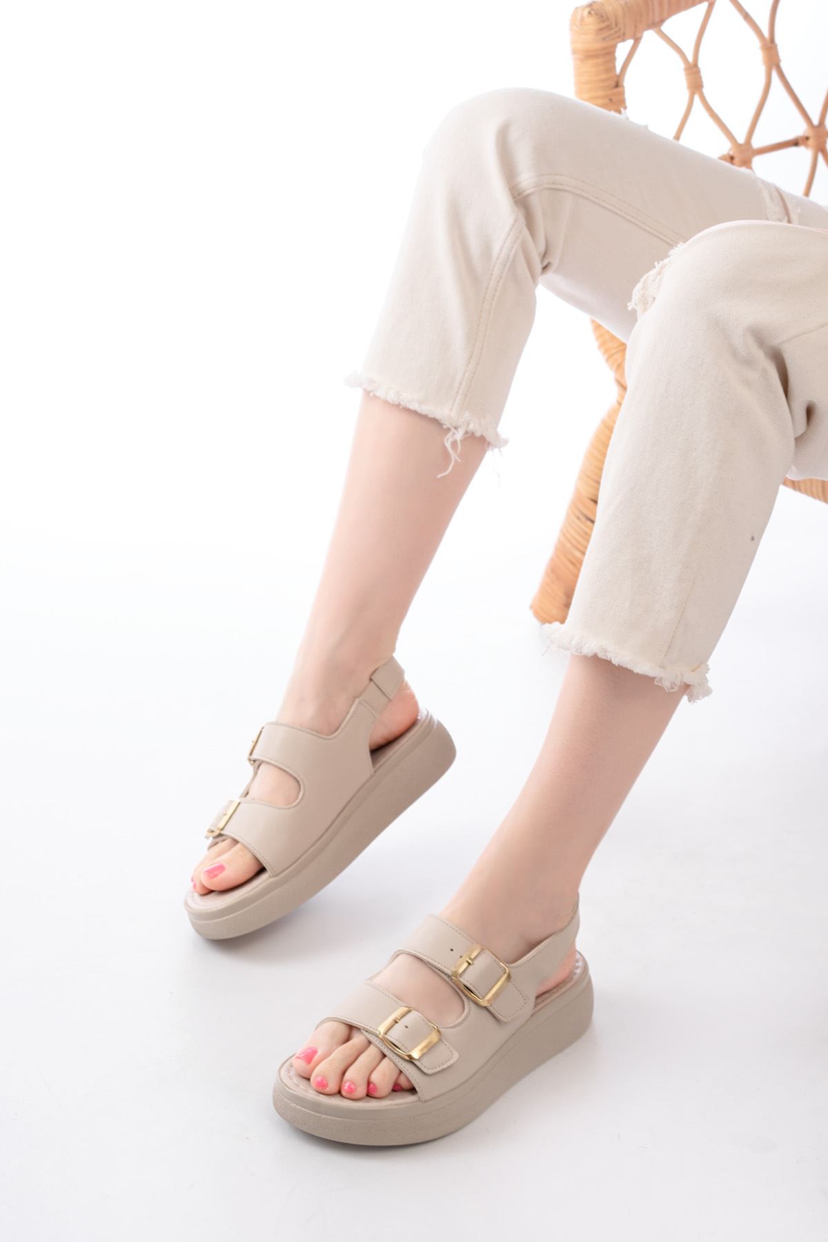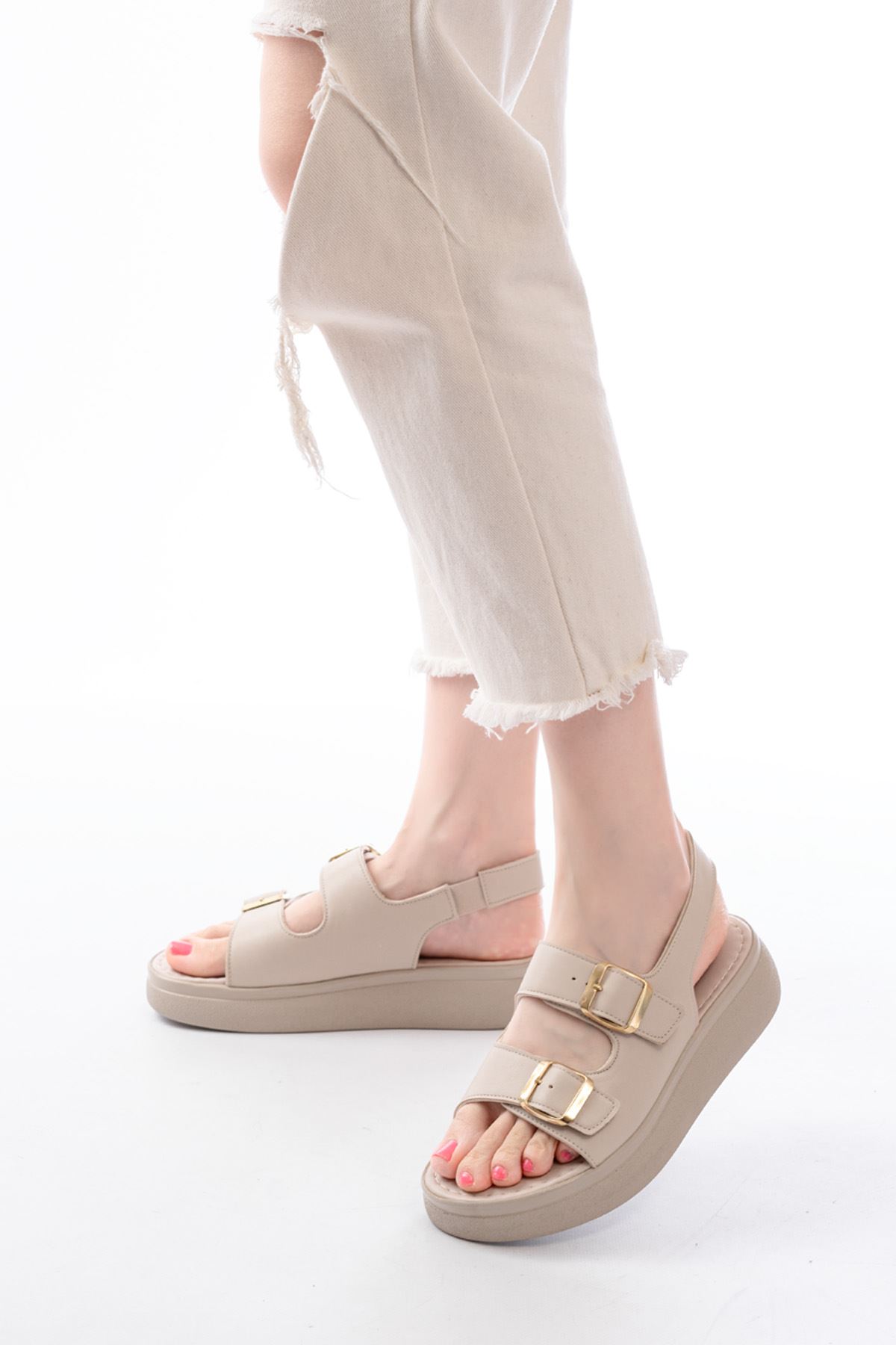 24413-572 Bej Günlük Dolgu Topuk Toka Aksesuarlı Kadın Sandalet