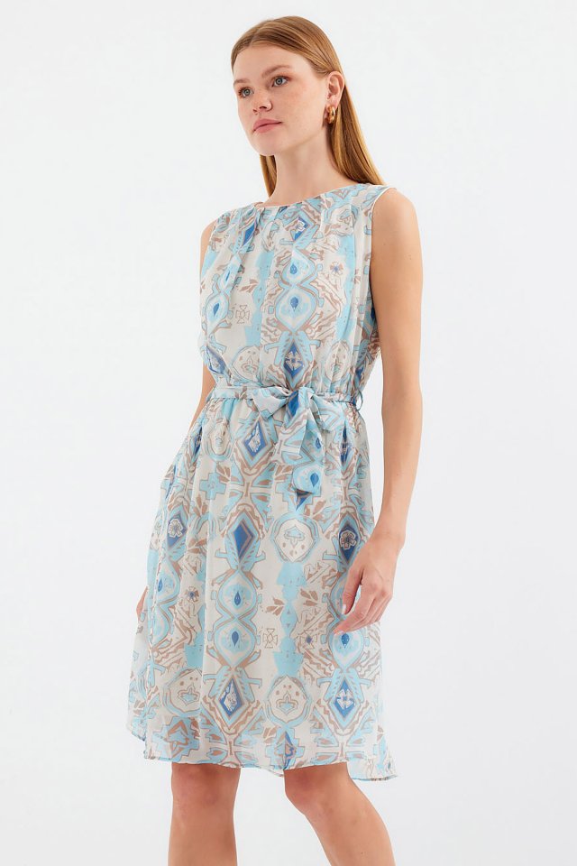2501 Desenli Sıfır Kol Şifon Elbise – Mavi